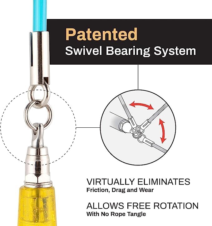 - INNOVATIVE & PATENTED SWIVEL-BEARING TECH: Our skipping rope comes with our innovative and patented swivel bearing system that is technically engineered for eliminating friction, drag, tangling and allows smooth turning action in all directions. Includes our swivel-bearing wrench that is specifically designed to secure and replace the bearings.