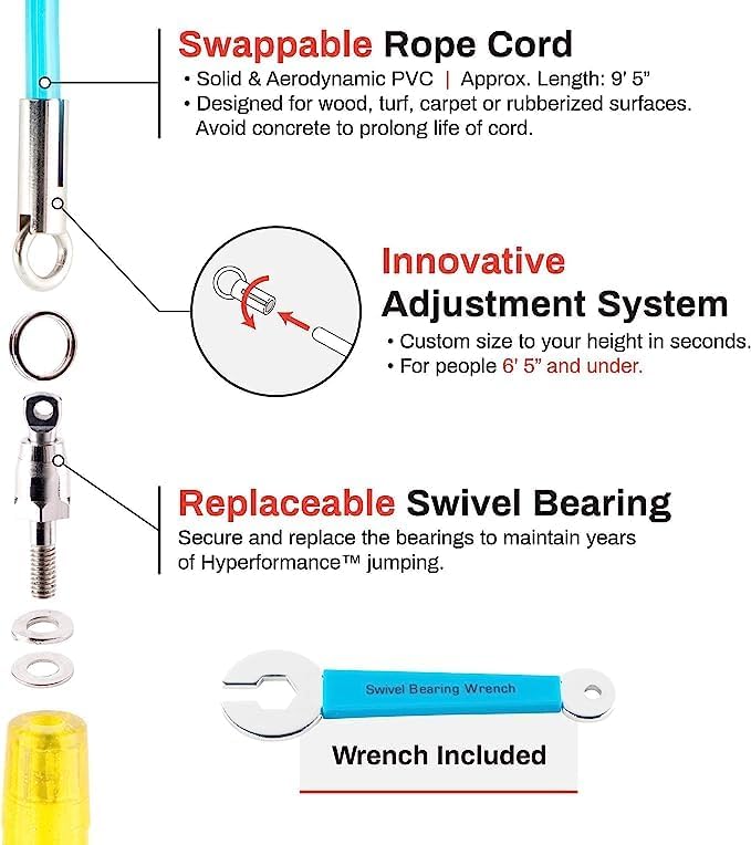 - HIGH-QUALITY MATERIAL: Our 9” handles are made of lightweight plastic for superior quality, durability, and looks. Ergonomically designed to fit comfortably in all hands. Super soft handle grips made of neoprene material gives you a soft, sturdy, and fatigue-free grip. Our 9'4" inches high-quality PVC cord is aero dynamic and perfectly weighted.