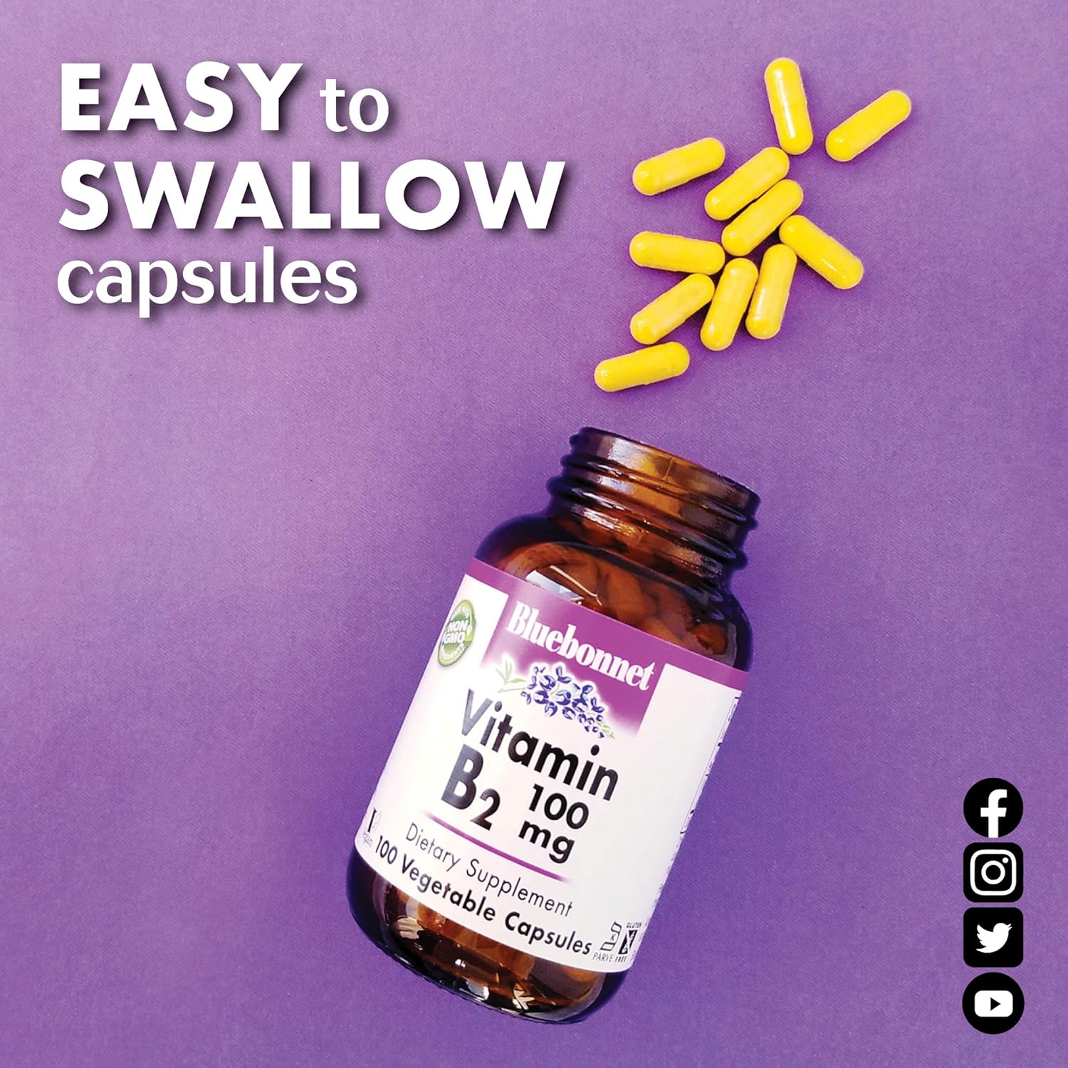 Bluebonnet Nutrition Vitamin B2 100 mg, For Cardiovascular and Nervous System Health, Soy-Free, Gluten-Free, Kosher Certified, Dairy-Free, Vegan, Non-GMO, 100 Vegetable Capsules, 100 Servings