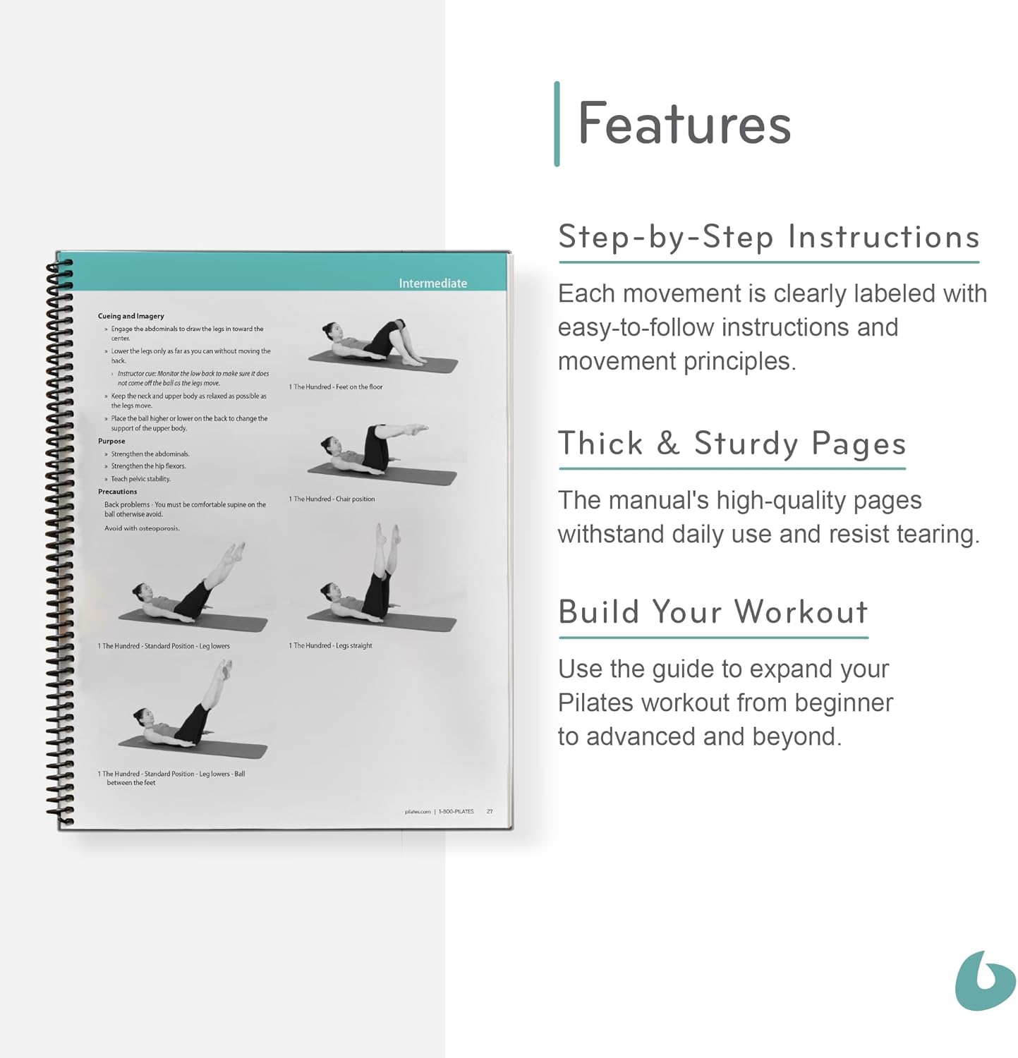 - PILATES EQUIPMENT GUIDE: Maximize your Pilates workout with our Mat and Ball Guide. This useful exercise guide features 132 pages with 22 exercises, full-color pictures, and step-by-step instructions so you can get the most from your floor workout. Mat and Ball sold separately.
