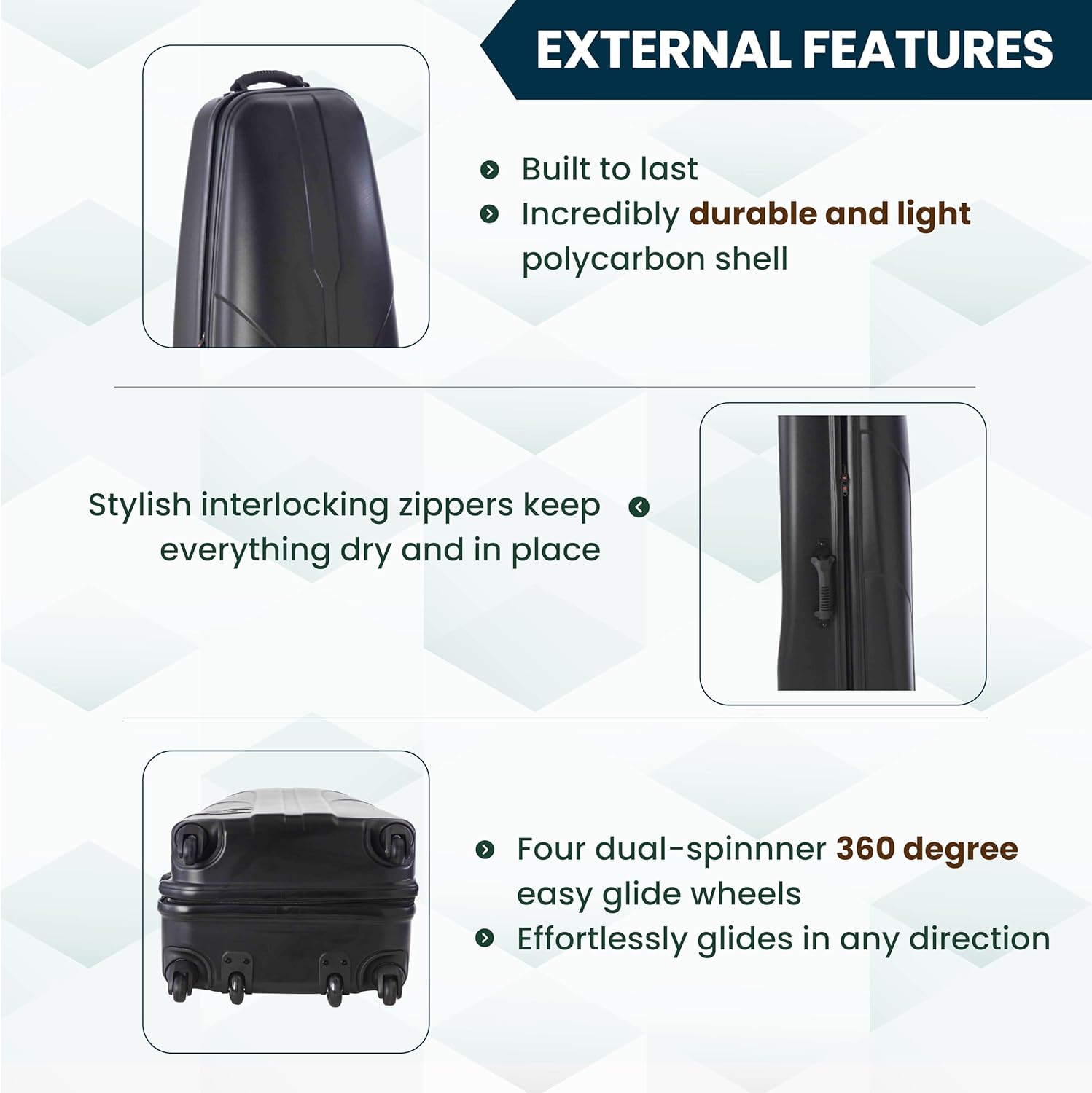 - 4 multi-directional spinner wheels and 2 in-line skate wheels allows the case to be pushed or pulled
