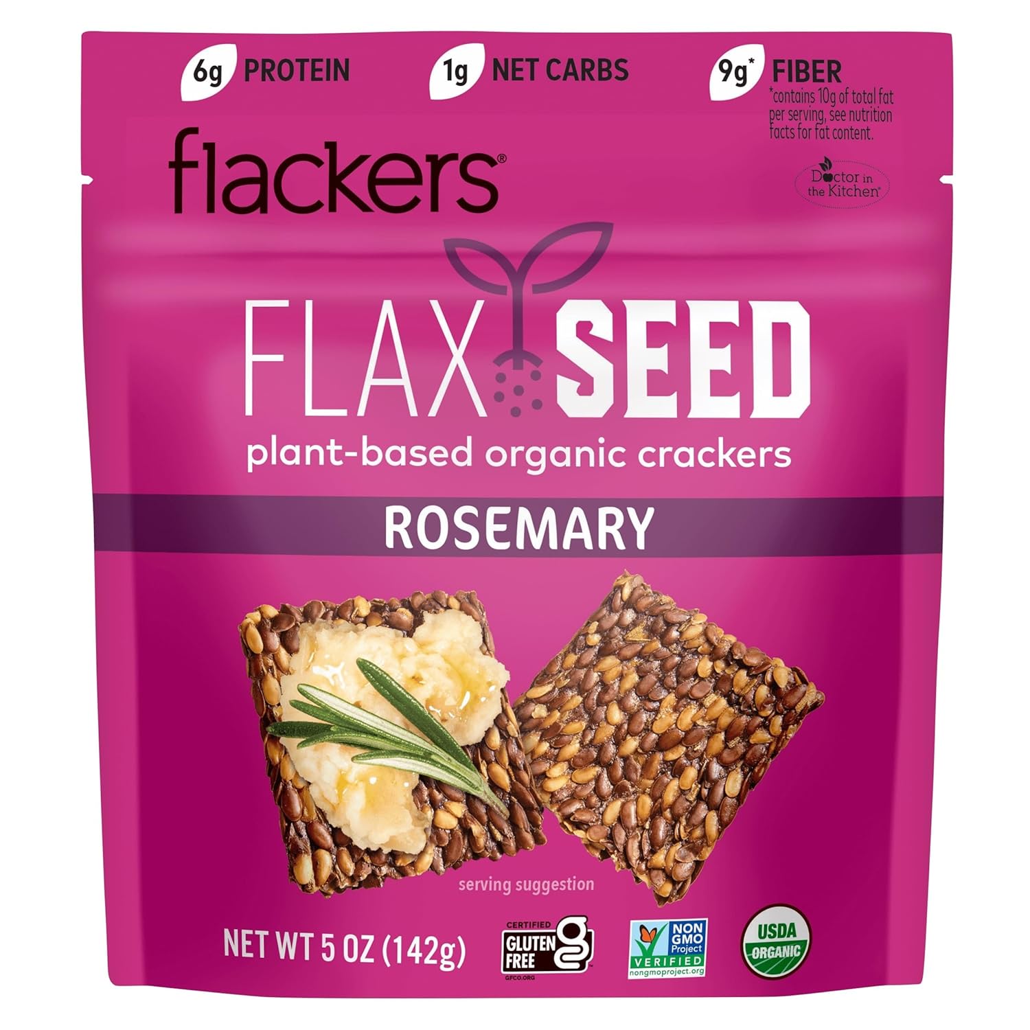 Flackers Organic Rosemary Flaxseed Crackers, 5 Ounce 1-Pack, Gluten Free, Non GMO, Vegan, Keto Snack, 9 Grams Fiber, 1 Net Carb