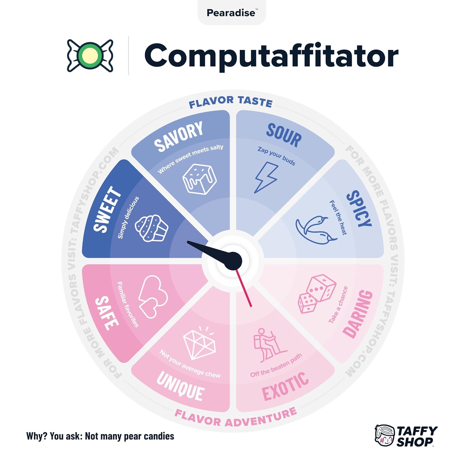 - Pearadise is a juicy escape with the sweet, mellow flavor of perfectly ripe pears in every chewy bite! One taste, and you’ll know you’ve found your taffy paradise.