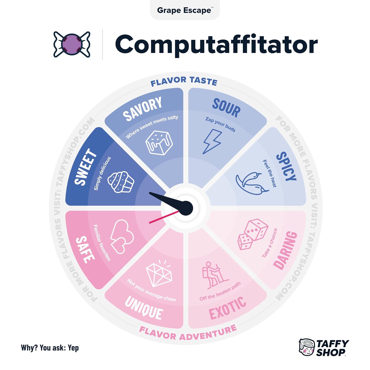 - Grape Escape is your ticket to a burst of juicy grape flavor in every chewy bite! Sweet, fruity, and totally irresistible, this taffy is perfect for grape lovers looking for a delicious getaway