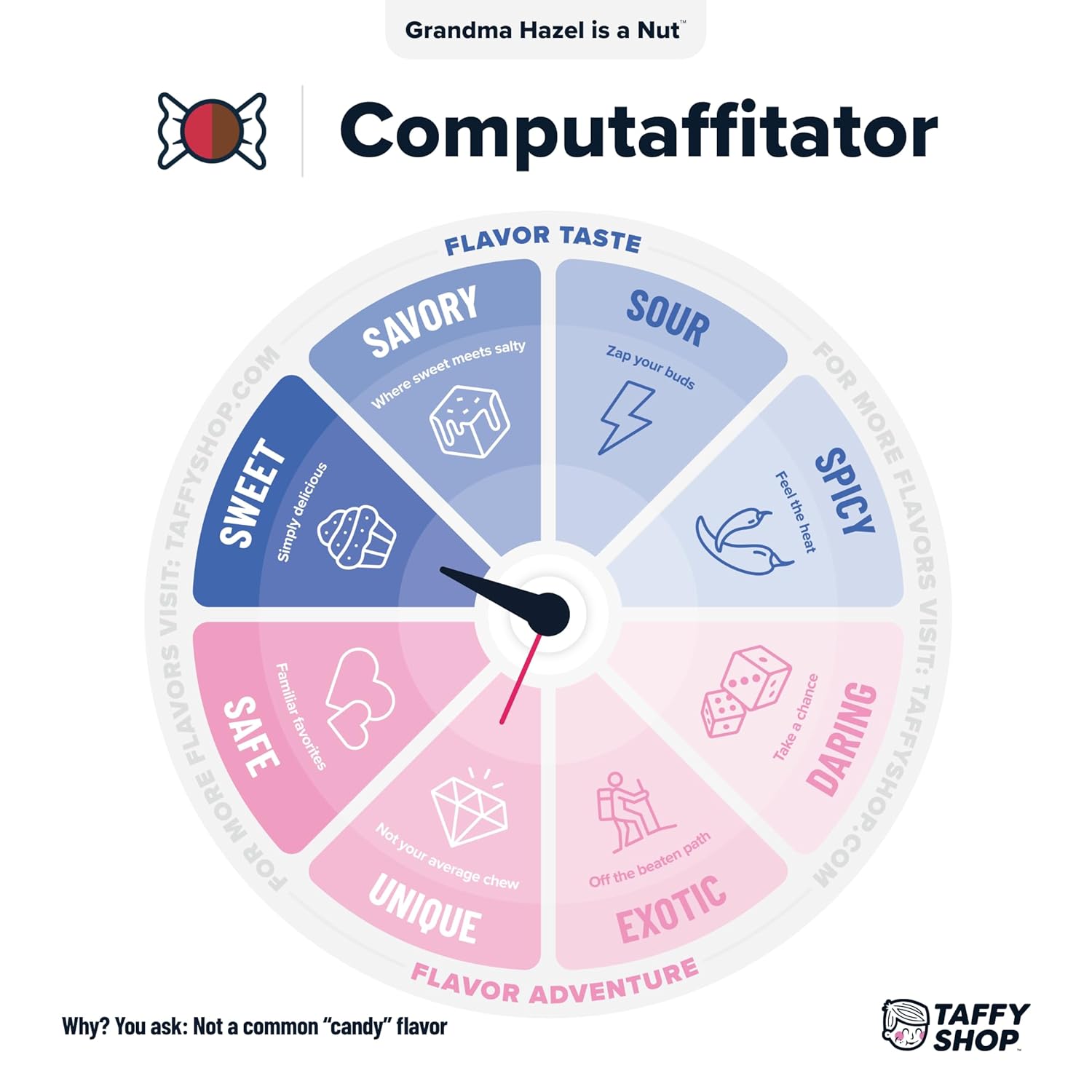 - Grandma Hazel is a Nut Taffy—Grandma’s secret recipe with a twist! Rich chocolate, crunchy hazelnuts, tangy raspberry, and smooth cream cheese. It’s like a candy bar, pie, and family reunion in one—nutty, delicious, and flavor-packed!