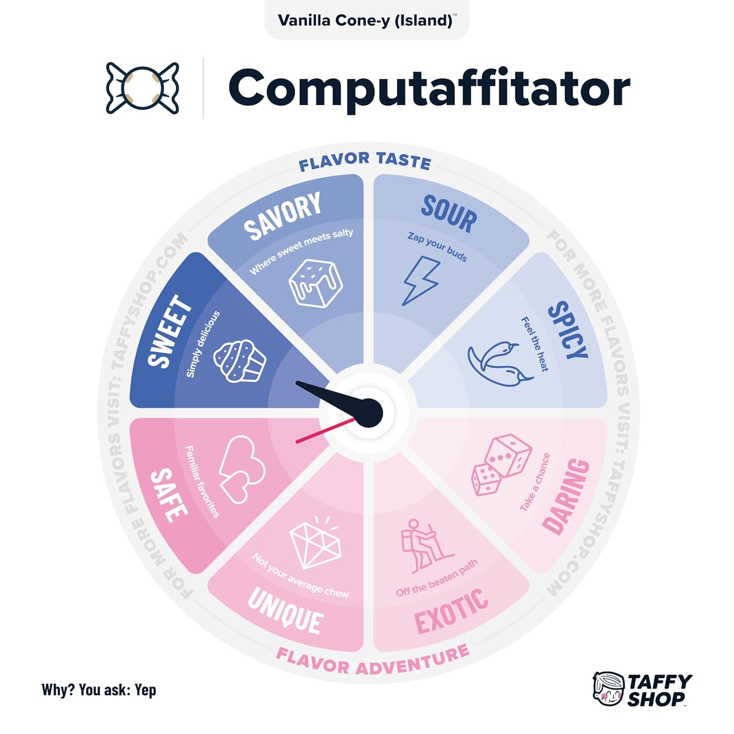- Vanilla Cone-y is like biting into a dreamy vanilla ice cream cone, but in taffy form! Sweet, creamy, and totally irresistible—this treat is a scoop of fun in every chewy bite!