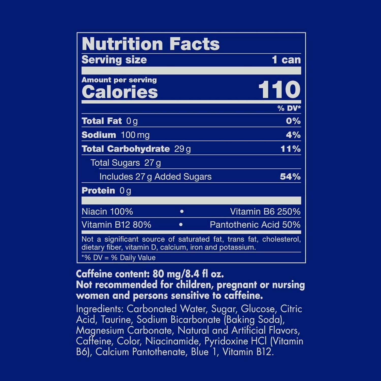 - Each 8.4 fl oz can contains 110 calories, 80mg of caffeine which helps to increase alertness, plus 27g of real sugar similar to a glass of apple juice of the same size