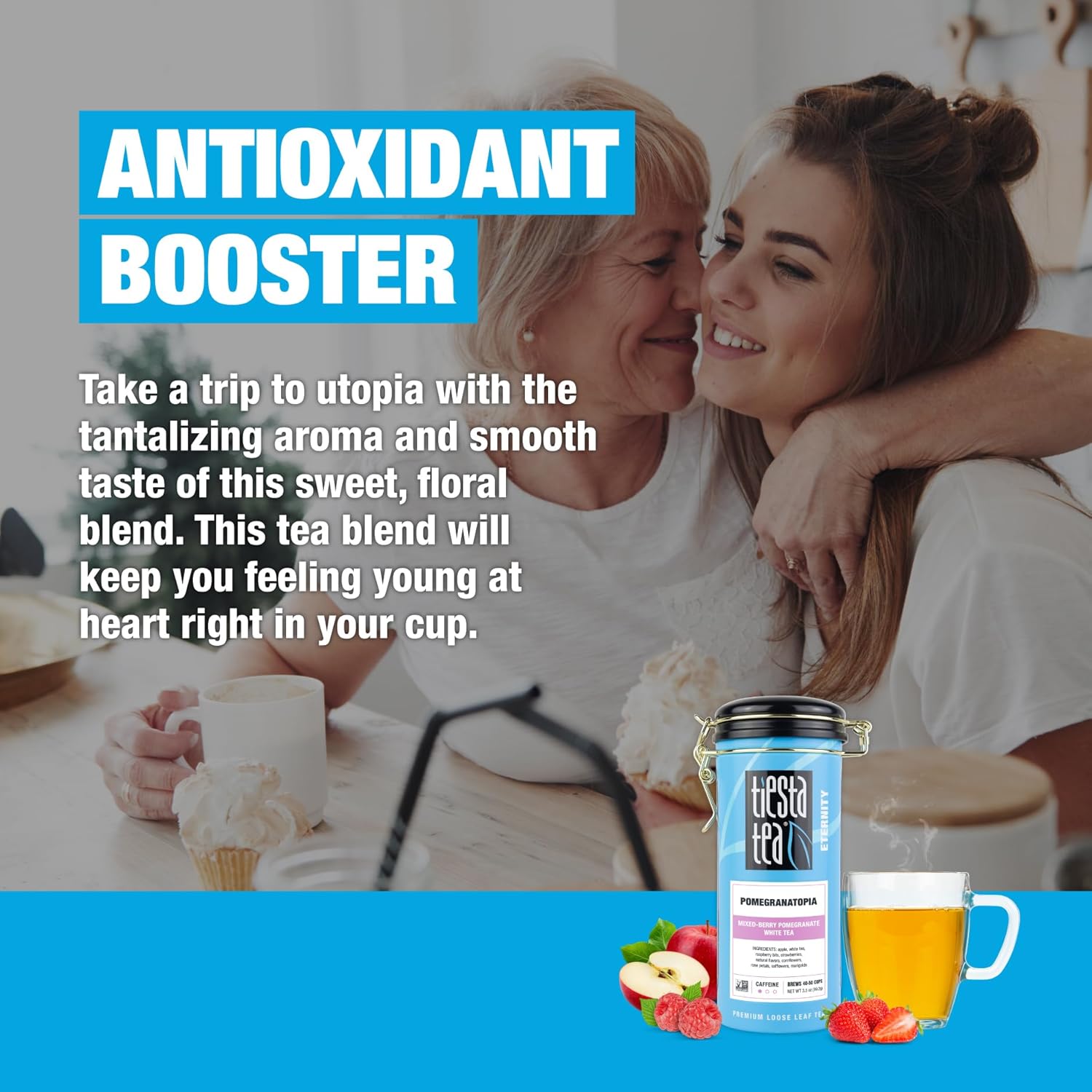 - POMEGRANATE MIXED BERRY-INFUSED WHITE TEA: Experience the vibrant flavors of Pomegranatopia with our Mixed-Berry Pomegranate White Tea. This organic loose leaf blend combines the tart sweetness of pomegranate with a delightful mix of fruit flavored tea. Whether you enjoy it hot for a cozy moment or iced for a refreshing treat, each sip captures the essence of summer.