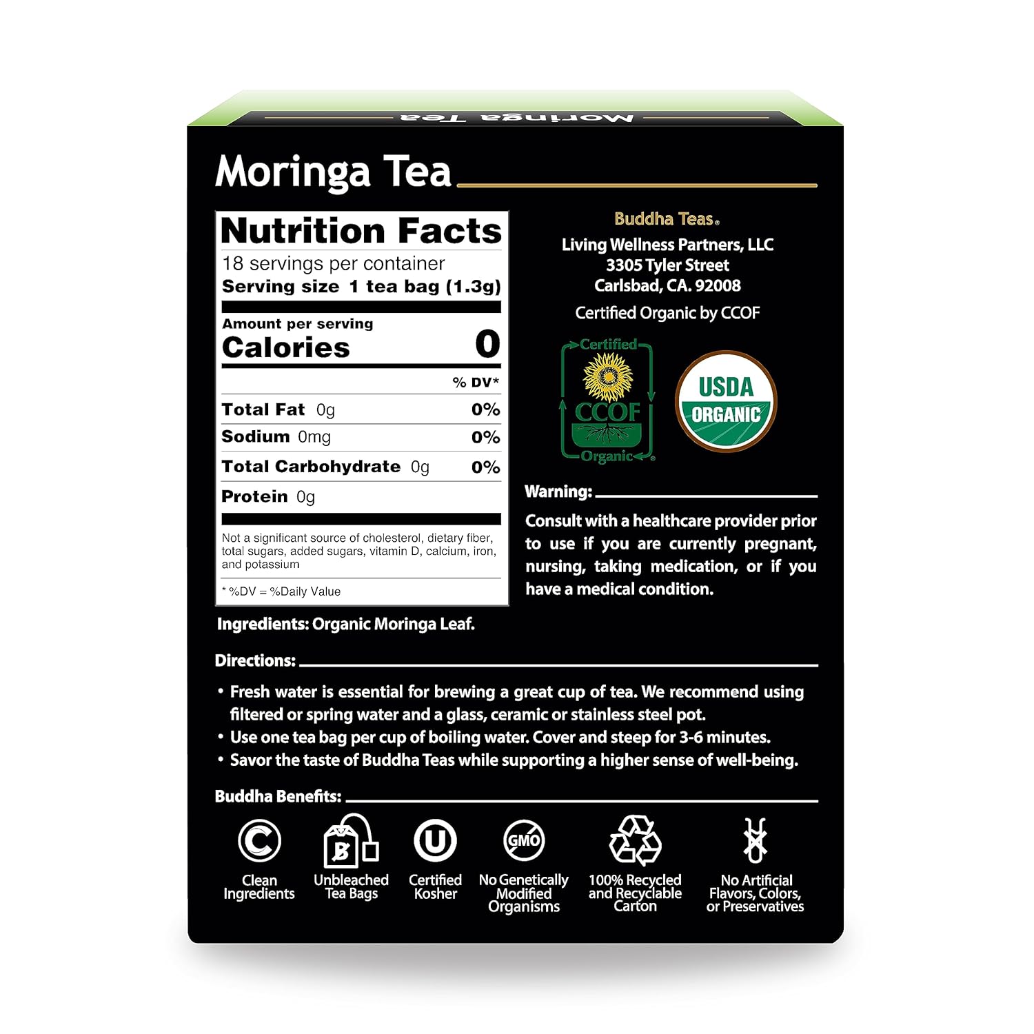- MORINGA TEA - Moringa is a nutrient-rich plant traditionally used in a variety of culinary and wellness practices. Buddha Teas’ Moringa Tea naturally promotes overall health and wellness, conveniently packed in a collection of 18 individually wrapped, unbleached tea bags.