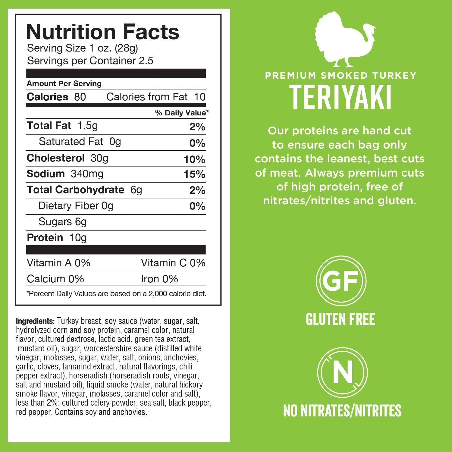 - TERIYAKI TURKEY: All-white turkey breast is blended with our specially teriyaki sauce. After it has been slow-smoked, the result is a healthy, incredibly portable snack. Classic sweet & savory flavor profile.