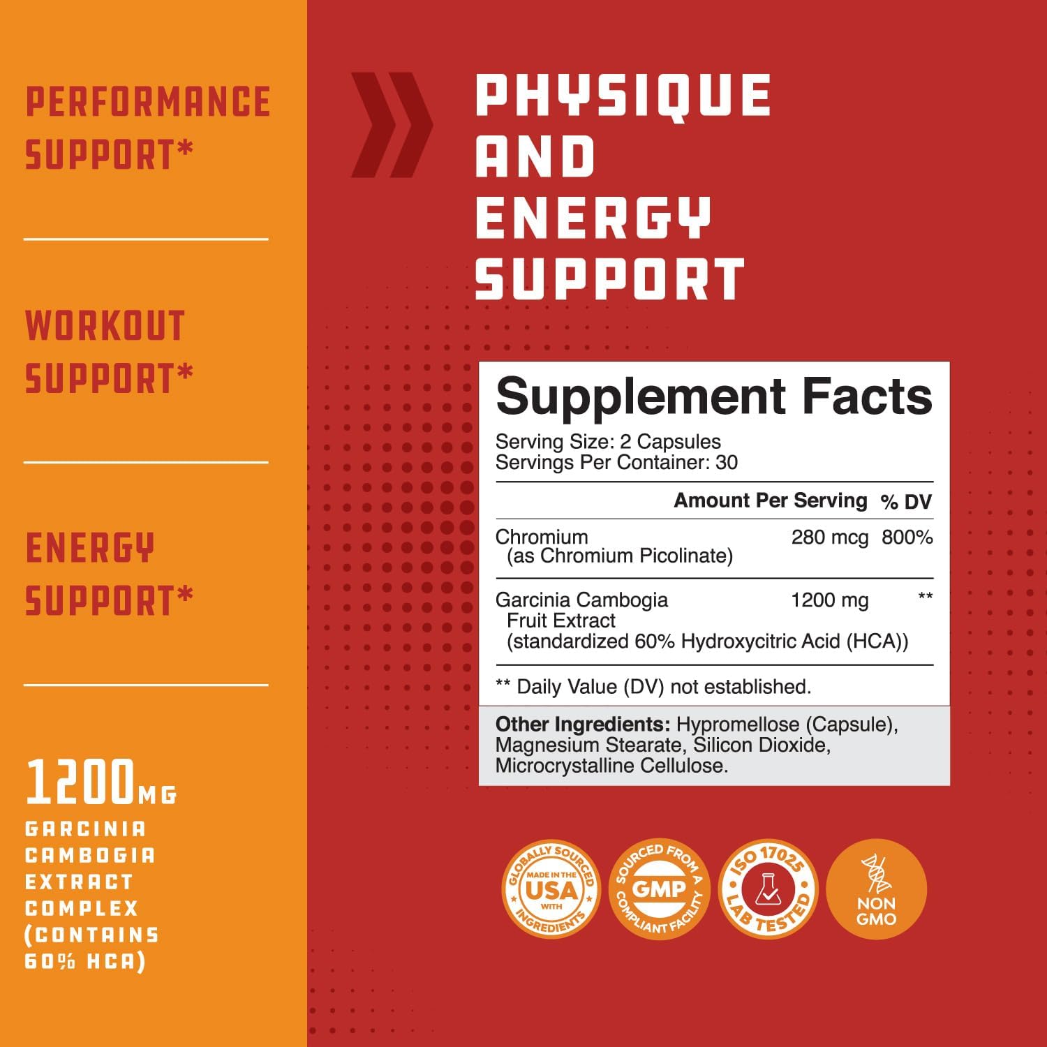 - PREMIUM INGREDIENTS FOR MAXIMUM RESULTS β Each serving delivers 1200mg garcinia cambogia extract with 60% HCA (hydroxycitric acid) and 280mcg chromium picolinate to promote wellness and support body composition goals.