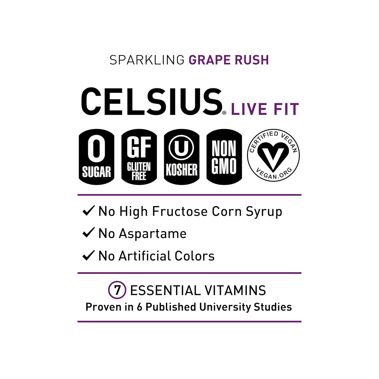 - Juicy, sweet, refreshing and a little nostalgic. Enjoy the flavor packed taste of CELSIUS Sparkling Grape Rush.