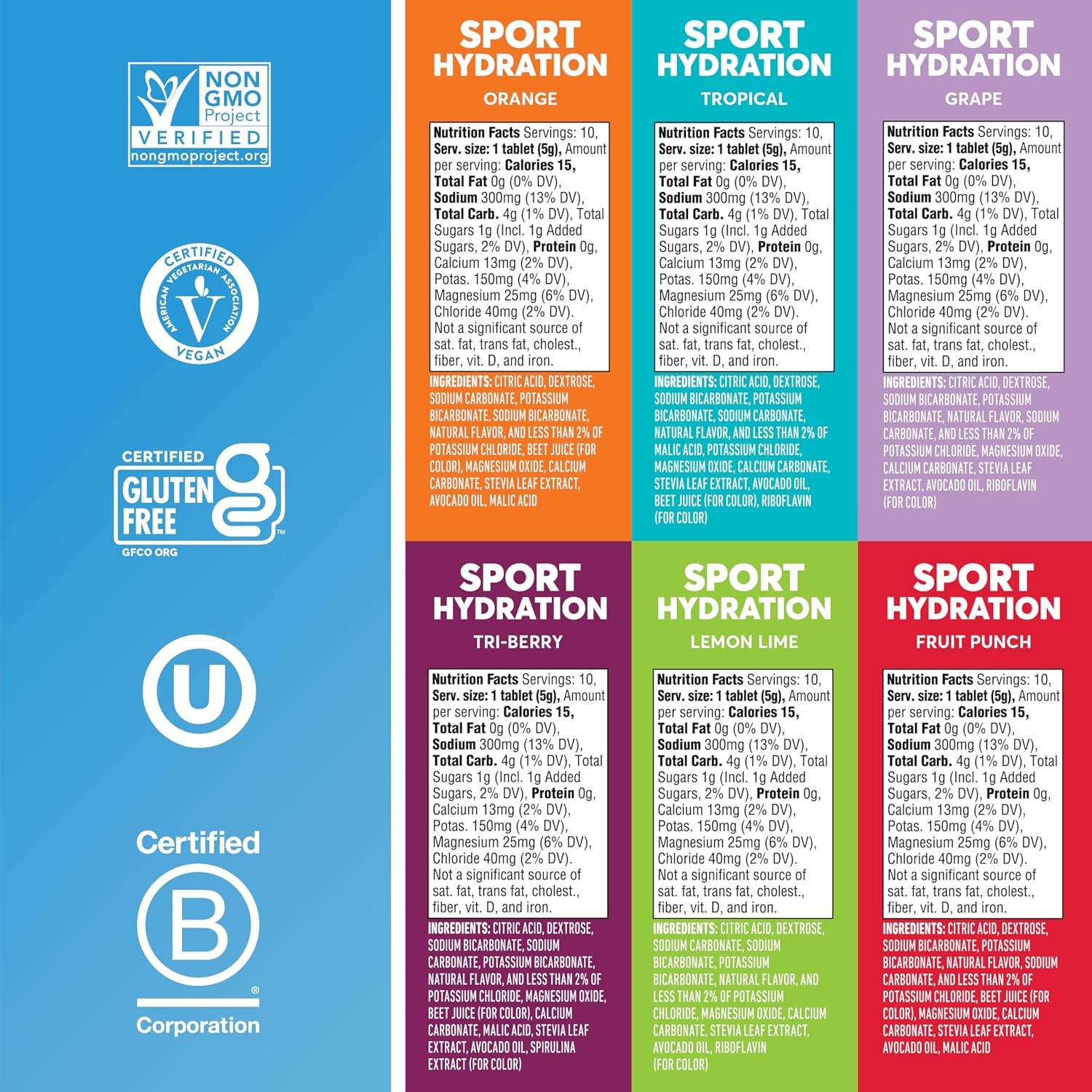 - 6 REFRESHING FLAVORS: This 6 pack contains one tube (10 tablets each) each of popular Nuun flavors Fruit Punch, Grape, Strawberry Lemonade, Tropical, Lemon Lime, and Tri-Berry for a total of 60 servings