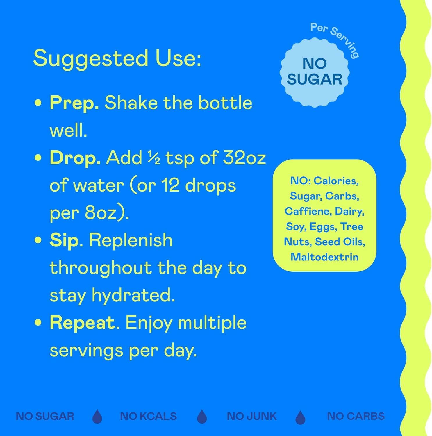- CONVENIENT TRAVEL SIZE HYDRATION β Whether you are dealing with electrolytes lost due to sweat, exercise, day-to-day activities, sickness or any other situation our hydration drops have you covered. Formulated to perfection for a Keto diet as well, this 4.06 oz bottle offers 48 servings and effortlessly fits into backpacks, purses, gym bags, or the palm of your hand. Perfect for on-the-go situations and exercise and morning routines.