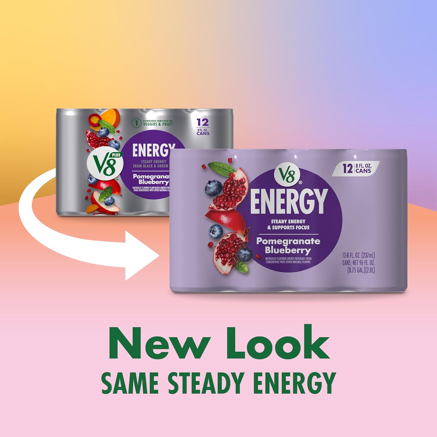 - Twelve (12) 8 fl oz cans of V8 Energy Pomegranate Blueberry Energy Drink