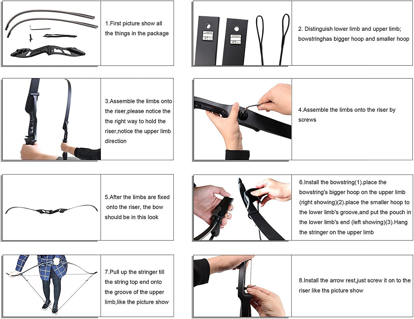- Recurve Bow Care and Storage Consideration: If you don't plan to shoot for more than three weeks, you can untie the bowstring. It is recommended to store it in a warehouse. Do not place it in overly hot areas (such as the trunk of a car) or overly humid places (such as basements). Do not place it vertically in a corner (as it may affect the accuracy of the bow over time). It is suggested to hang it horizontally or store it horizontally in a bow bag or box.