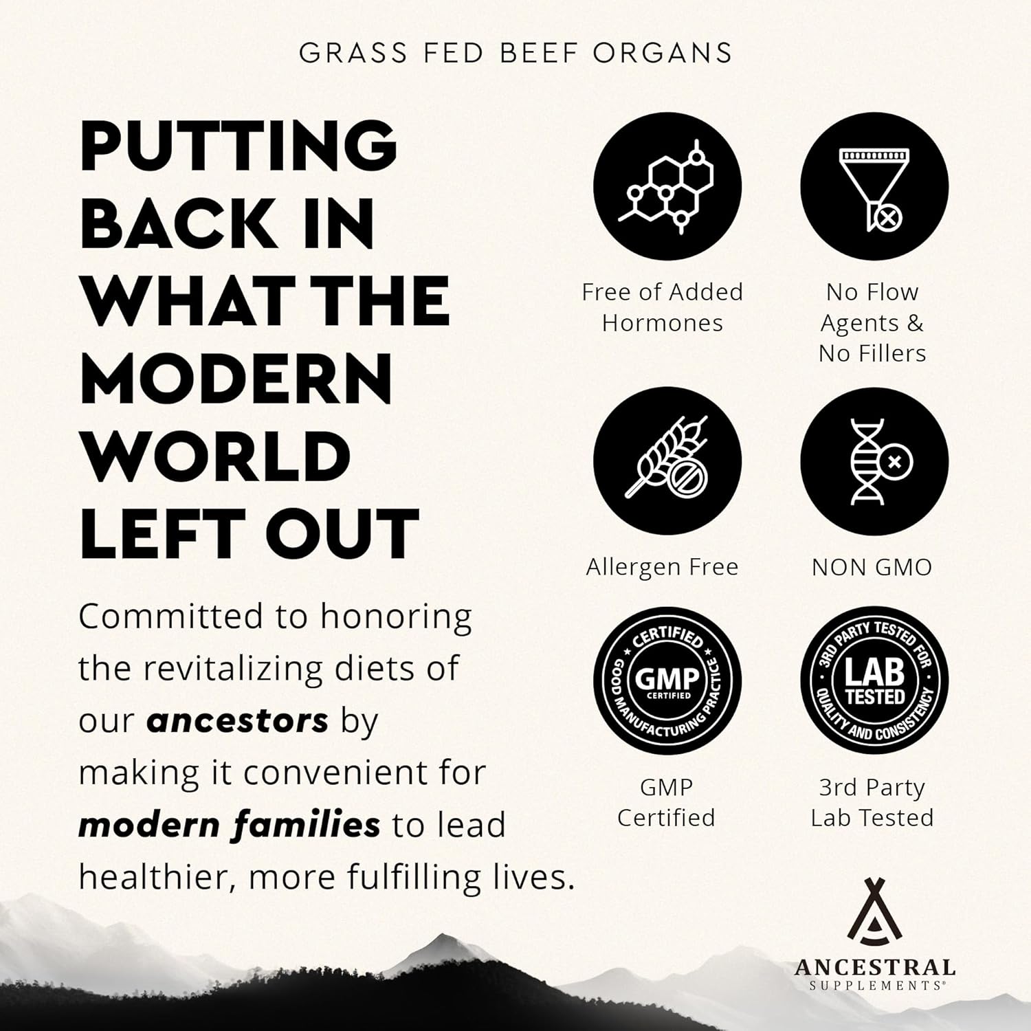 Ancestral Supplements Grass Fed Beef Organ Supplement, Supports Whole Body Wellness with Proprietary Blend of Liver, Heart, Kidney, Pancreas, Spleen, Freeze-Dried Beef, Non-GMO, 180 Capsules
