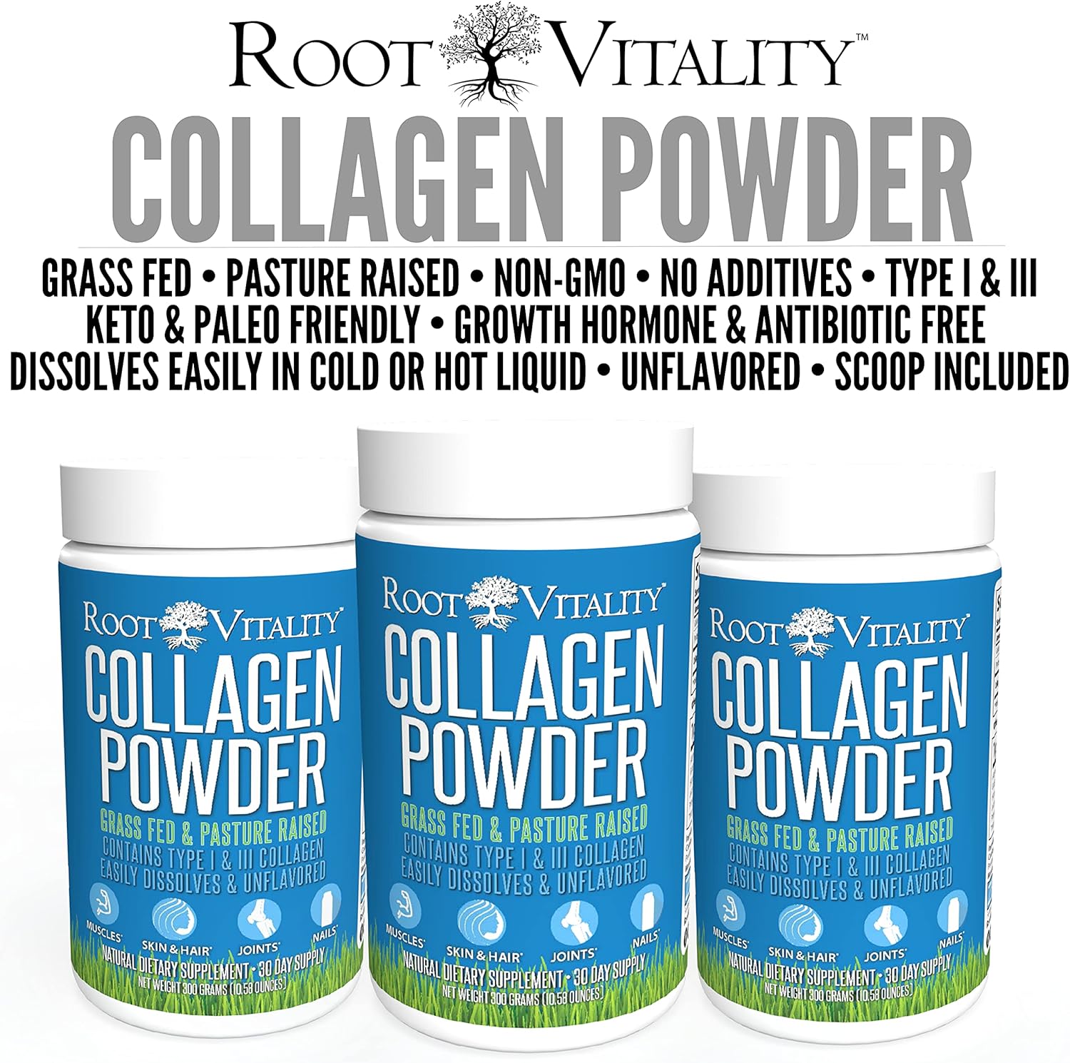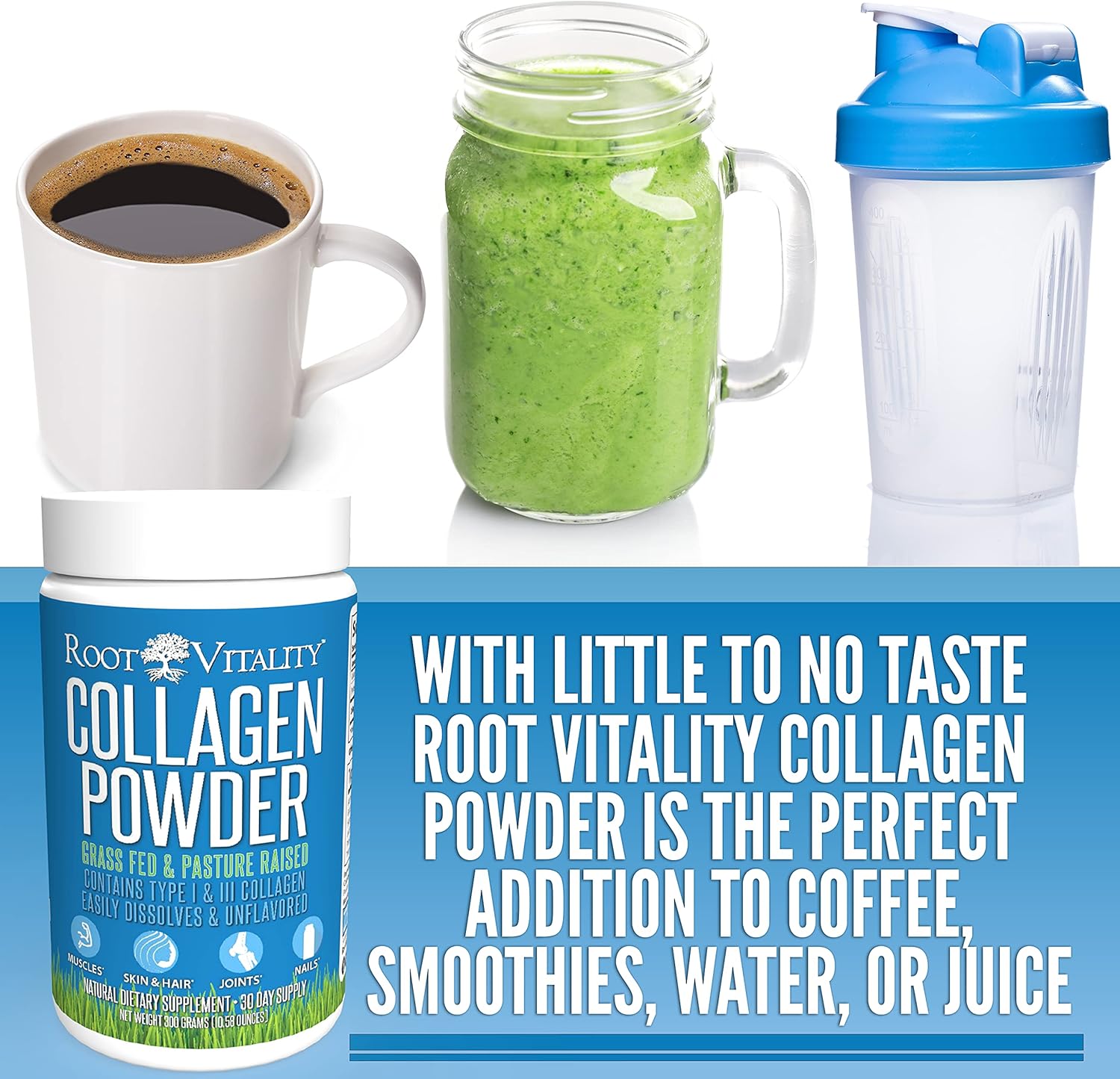 - UNFLAVORED: Root Vitality Collagen Peptides Powder uses a formula with an unflavored taste and no additives, making it perfect for adding to water, smoothies, or any other drink.