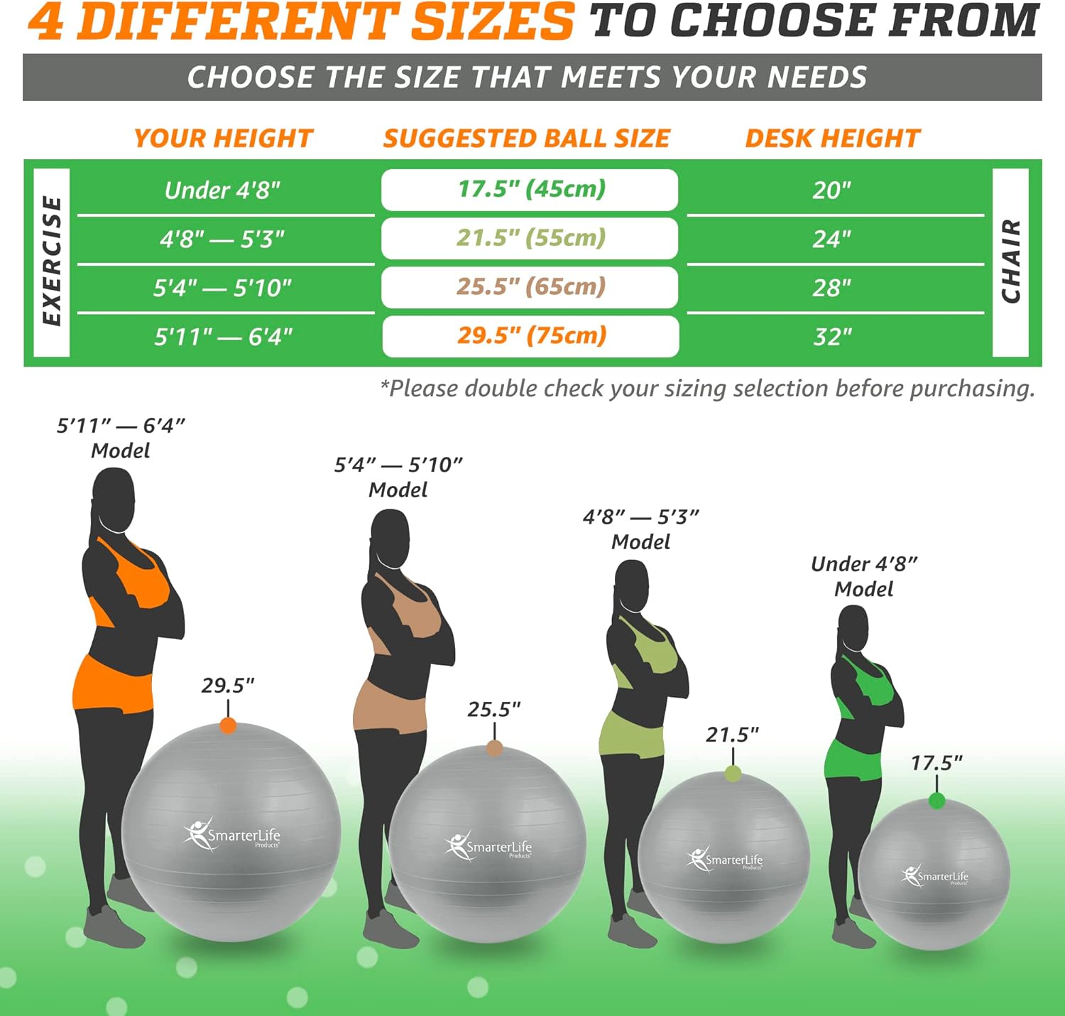 - THE RIGHT SIZE FOR YOU: We offer a choice of 45 cm, 55 cm, 65 cm, and 75 cm sizes to suit your height so that you can easily and conveniently find the correctly sized work out ball to sit on or exercise with. Our sizing chart uses the user’s height to help you select the correct size for workouts and uses desk height to help you select for use as a chair.