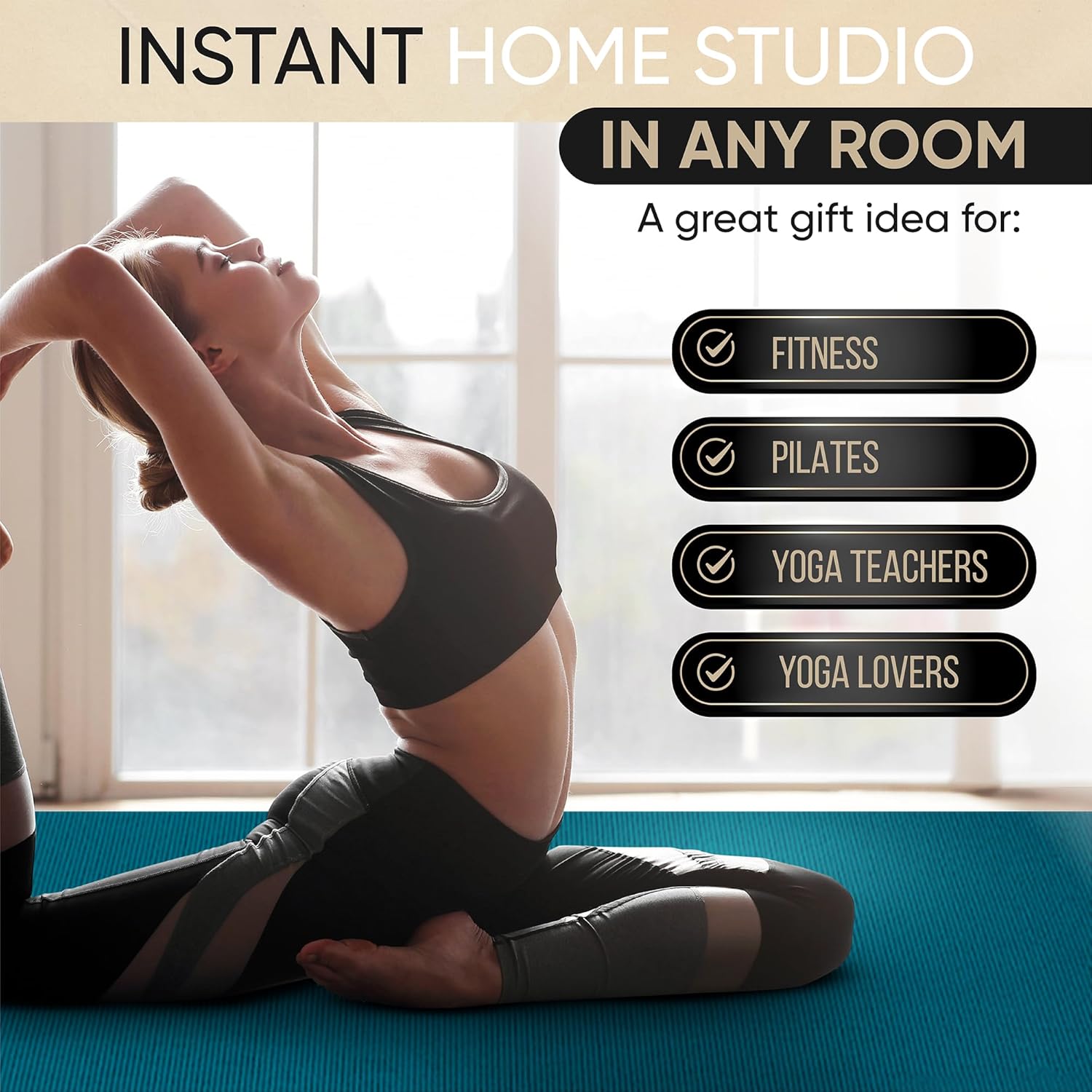 - INSTANT HOME STUDIO IN ANY ROOM – Go ahead and stretch out like never before. Just unroll to transform any room in your home into your very own home studio or gym. Our spacious mat is large enough for any yoga pose, meditation, stretching, light cardio workout or barefoot bodyweight exercise – by yourself or with a friend.