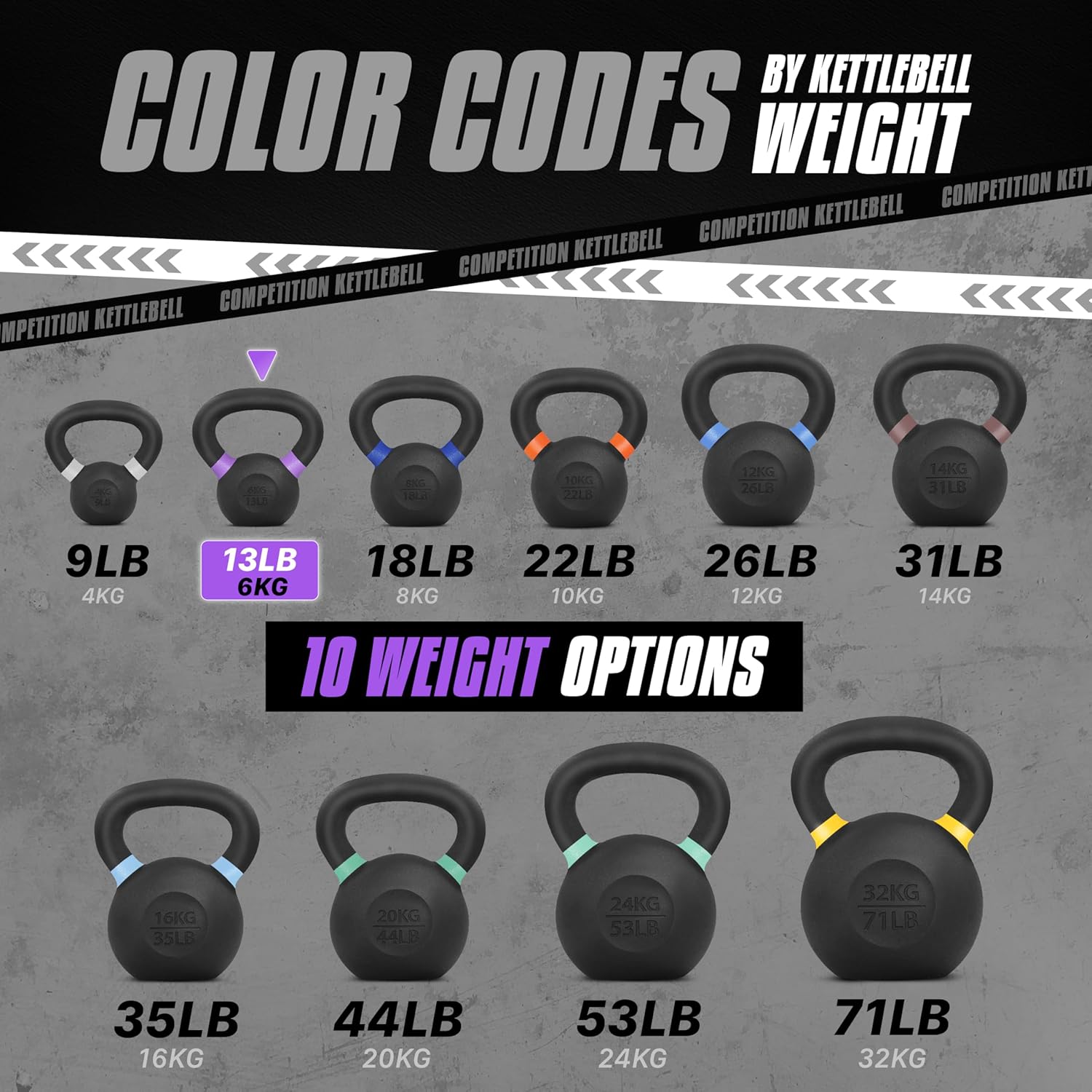 - COLOR-CODED RINGS & DUAL MARKINGS FOR BOTH LB & KG: Color-coded rings make different weights easy to identify at a glance. Each kettlebell is labeled with both LB & KG. No need to use the calculator to figure out how much you are swinging!