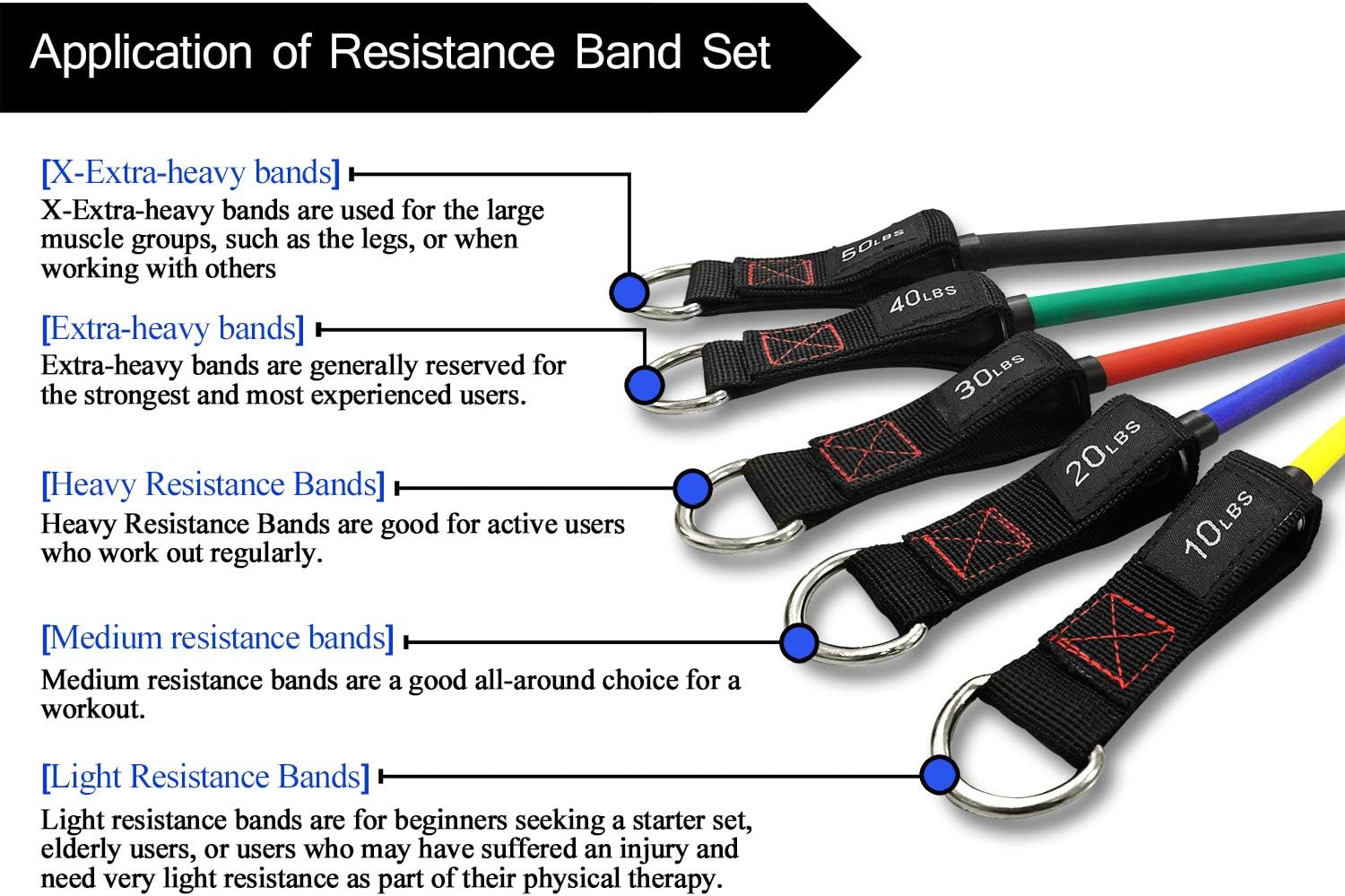- Get your complete resistance bands set now: Youβll feel 100% satisfaction from the moment you received the exercise bands set. They come with a lightweight carrying bag, a sturdy door anchor, a pair of larger straps and handles for home gym exercise, door exercise, weightlifting, stretch exercise,leg exercise, etc. We are quite sure that you will be super-impressed with the durability, portability, versatility and high quality of our resistance exercise bands