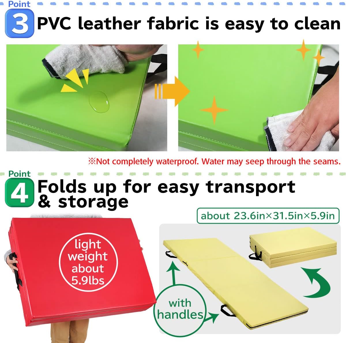 - This mat can be folded in thirds, making it lightweight and compact despite its wide size, making it easy to carry.