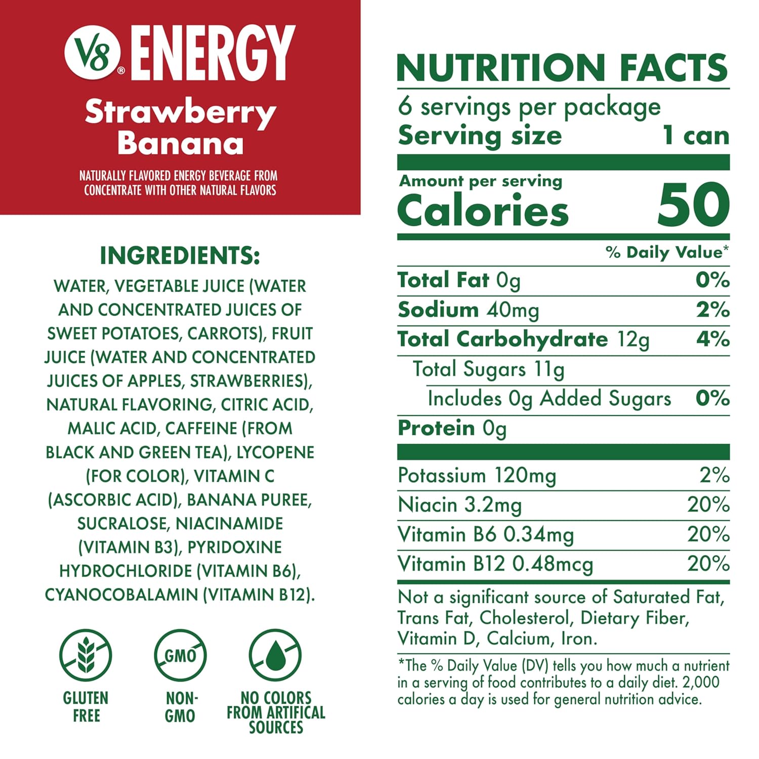 - Twenty-four (24) 8 fl oz cans of V8 +Energy Strawberry Banana Juice Energy Drink