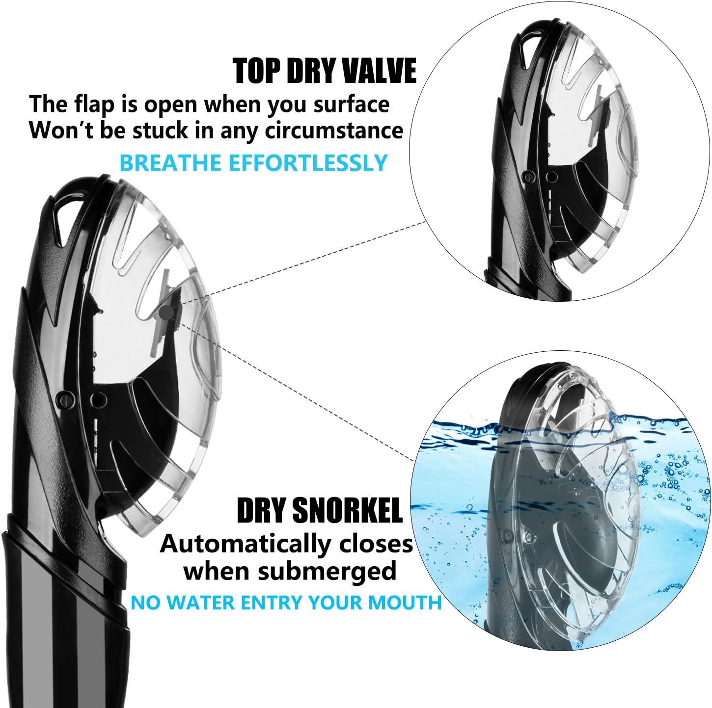 - Advanced Dry Valve and Splash Guard: The innovative dry top valve automatically seals when submerged, effectively blocking water entry. The splash guard further protects against waves, while the advanced design prevents clogging from sand or debris, ensuring consistent and comfortable breathing.