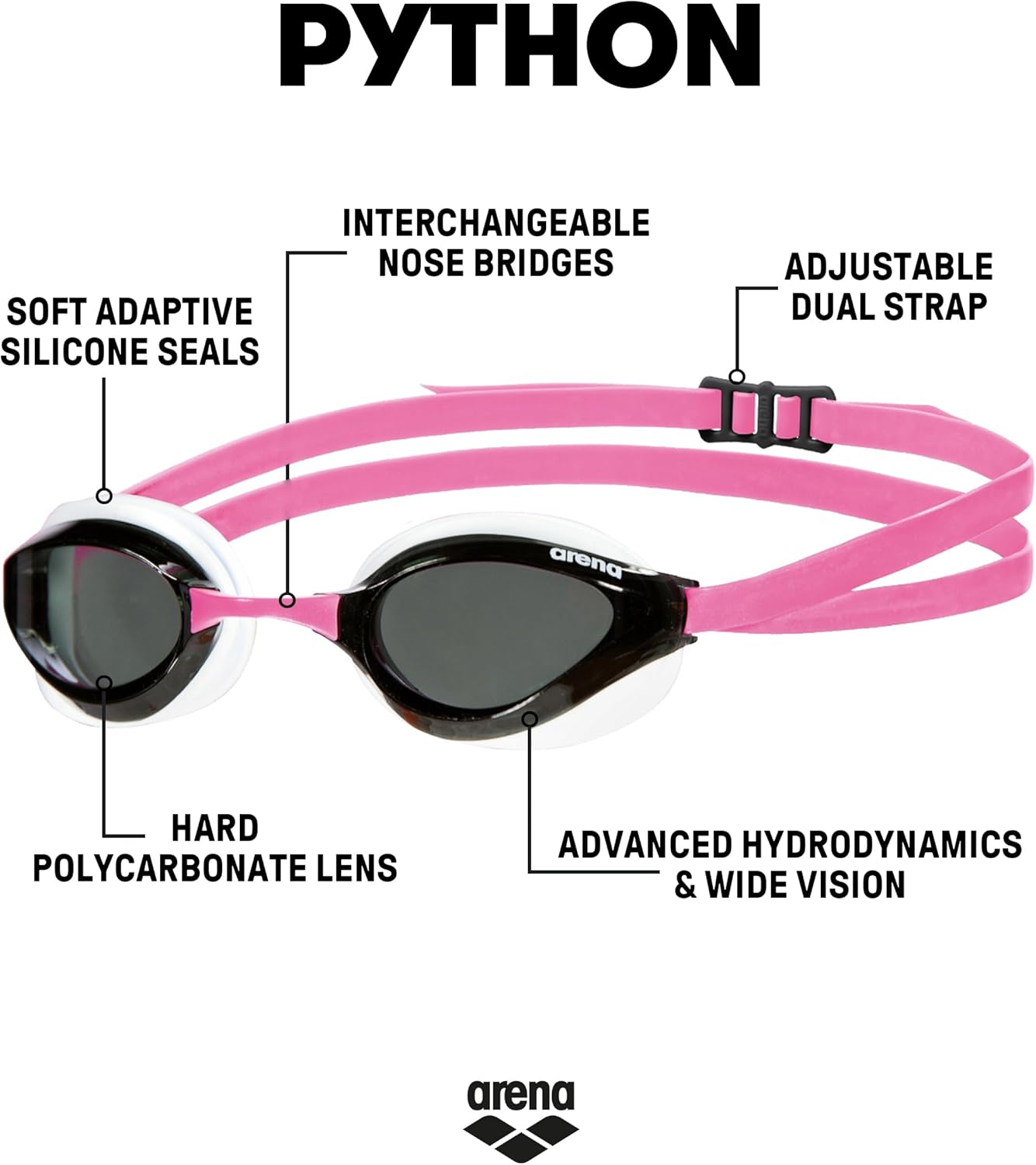 ARENA Unisex Python Racing Swim Goggles for Men and Women Anti-Fog No Leak Max Comfort Dual Strap, Mirror/Non-Mirror Lens