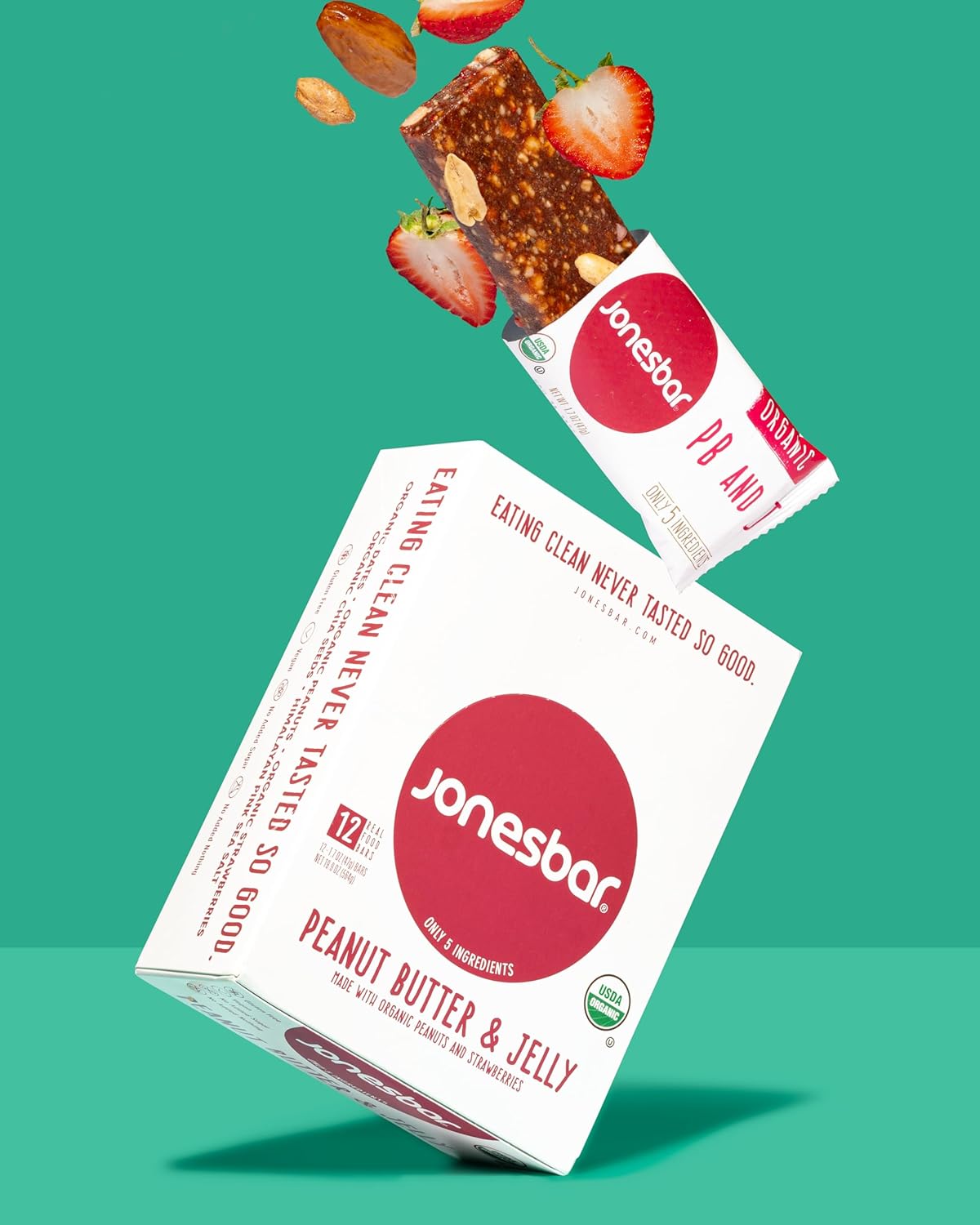 JONESBAR (Peanut Butter and Jelly, 12 Count (Pack of 1)), USDA Organic Fruit & Nut Bar, Non-GMO, Kosher, Vegan, Gluten Free, Simple Snack Bar