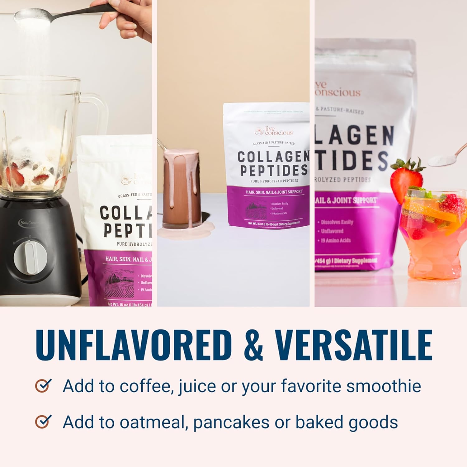 - Natural Taste β While some customers take no notice, since everyone's palate is different, the Live Conscious Collagen Peptides naturally-sourced formula may have a mild taste that you would most prefer adding to your favorite smoothie.