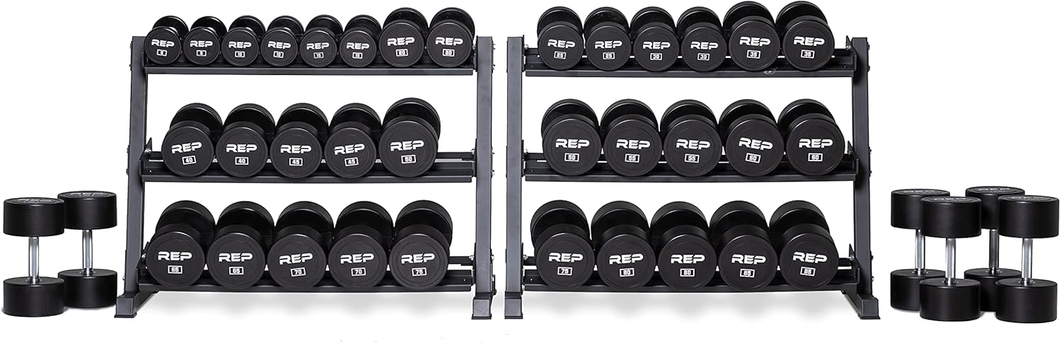 REP Fitness Urethane Coated Round Dumbbells, 5 to 100 lbs, Singles or Pairs, With or Without Rack, Steel Core, Rubber Encased, Chrome Handles, Professional Weights for Home Gym Strength Training
