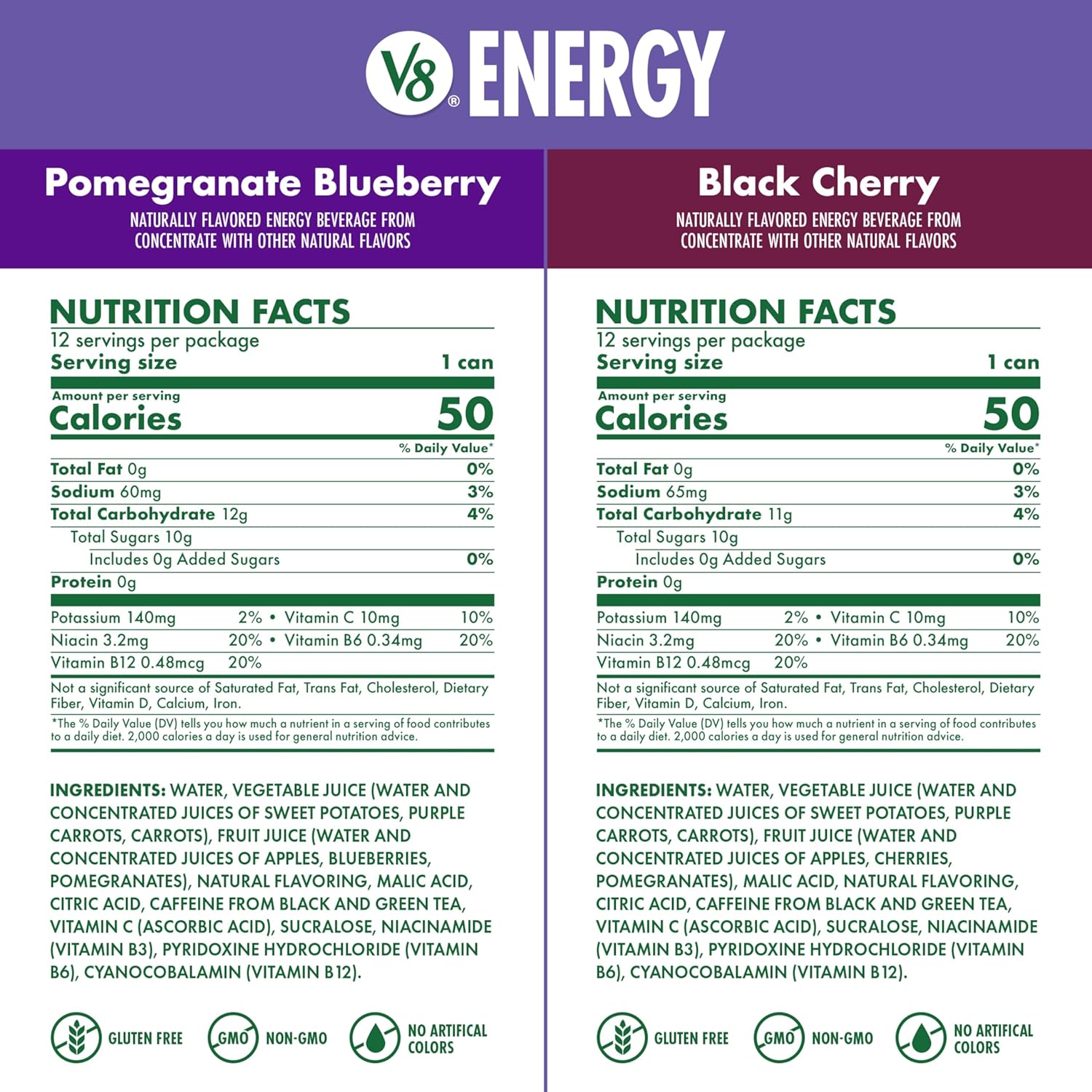 - Variety pack with twelve (12) 8 fl oz cans each of V8 +Energy Black Cherry and Pomegranate Blueberry Juice Energy Drinks