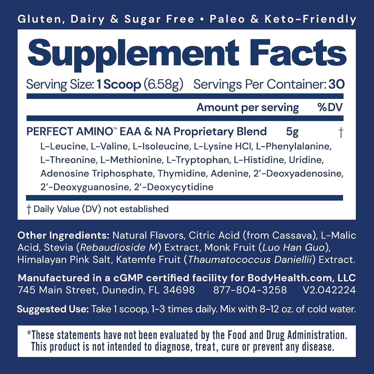 BodyHealth PerfectAmino Powder - BCAA and EAA Powder for Pre and Post Workout - Amino Acid Energy Drink for Men and Women to Support Lean Muscle and Recovery - Mixed Berry - 30 Servings