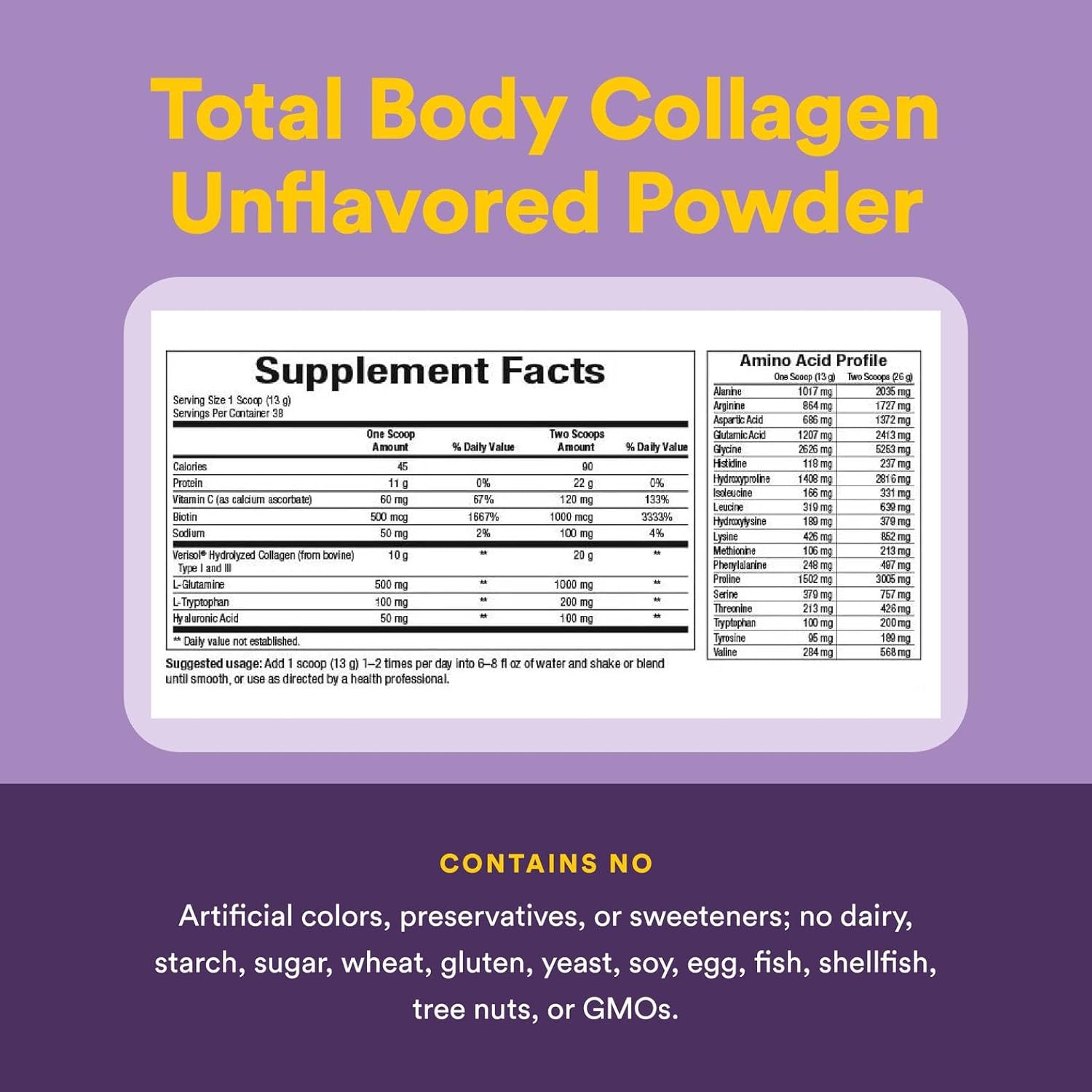 Natural Factors Total Body Collagen Bioactive Peptides Powder for Healthy Skin, Hair & Joints, Unflavored, 500 g