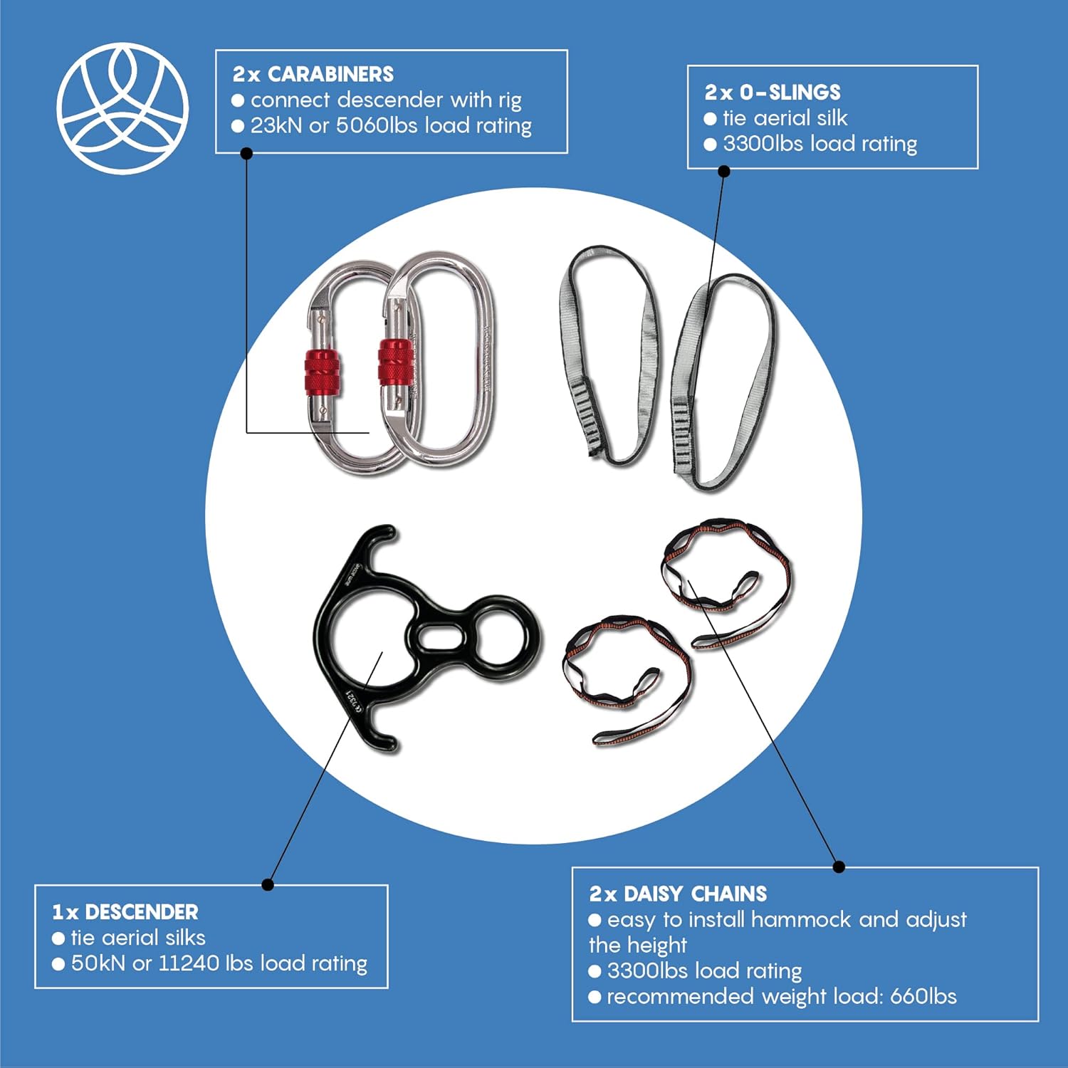 - β ALL YOU NEED: Includes complete set of aerial silk (9 yd), 1 figure 8, 2 carabiners, 2 extension straps (3 ft), 2 o-slings, and a manual guide. We got everything you need!