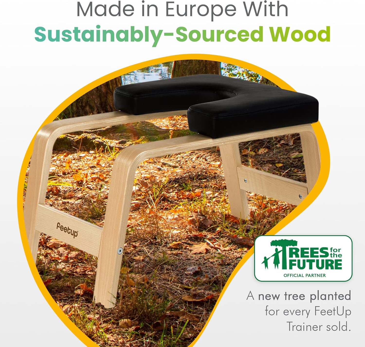 • Made with Earth-Friendly Materials - FeetUp’s headstand inversion bench won’t just benefit you. It’s good for the environment, too. These yoga inversion chairs are composed of sustainable vegan leather and dark or light beech wood.