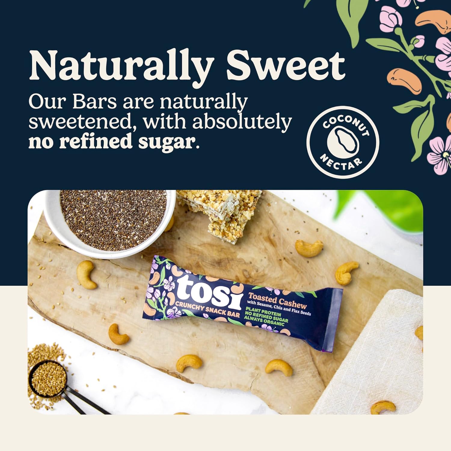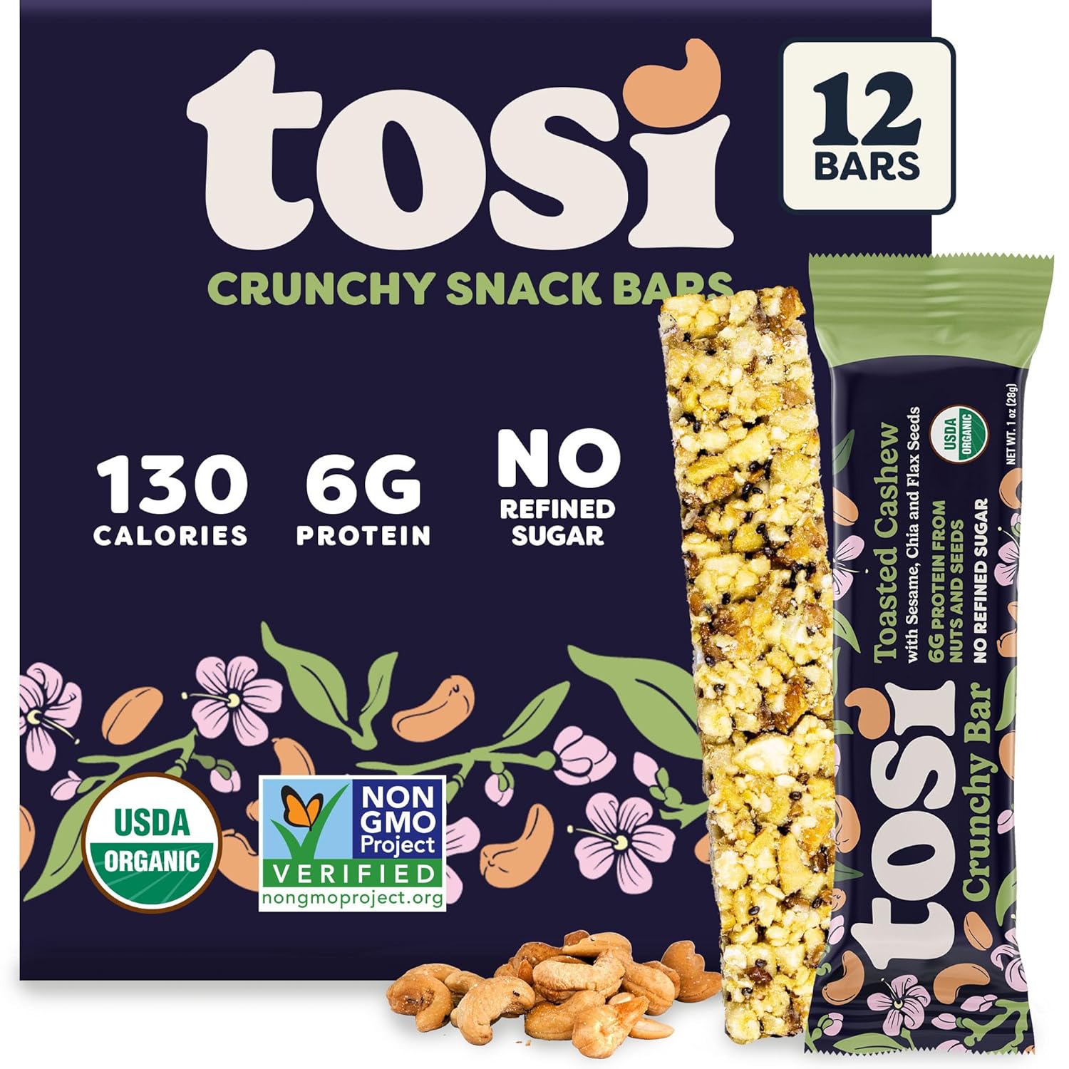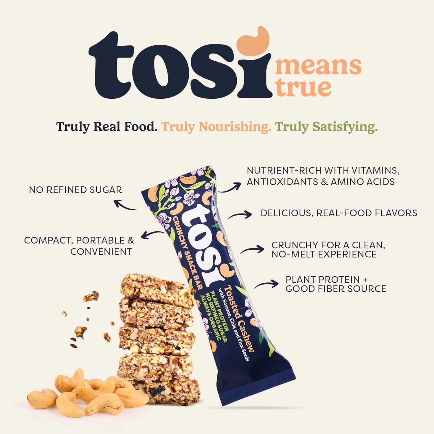 Tosi Cashew Protein Bars, Plant Based with Nuts, Gluten-Free Crunchy Snacks, Vegan, Organic, Flax & Chia Seeds, Soy-Free, Omega 3s, 5G Protein, 1 oz, 12-Pack