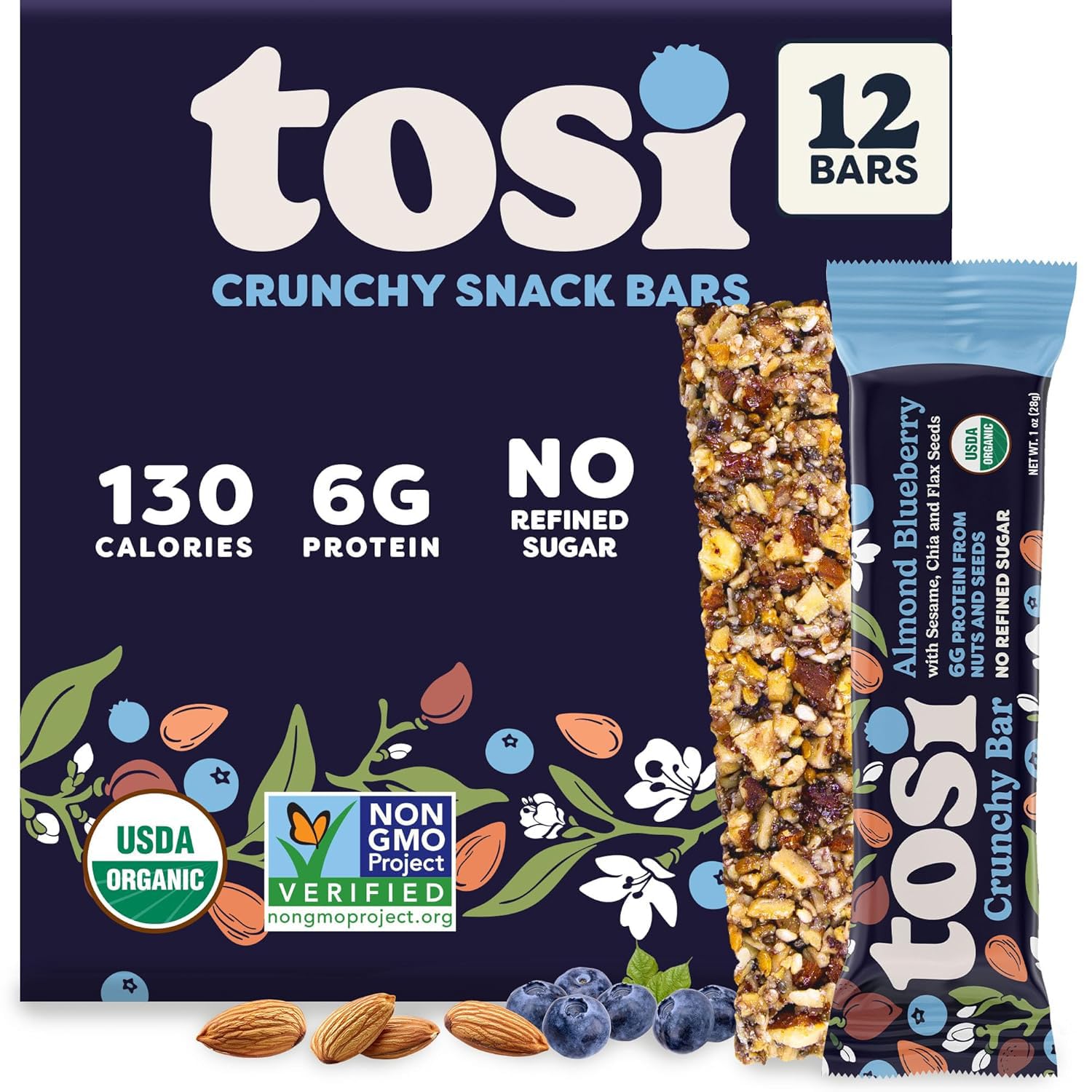 Tosi Almond Blueberry Protein Bars, Plant Based with Nuts, Gluten-Free Crunchy Snacks, Vegan, Organic, Flax & Chia Seeds, Soy-Free, Omega 3s, 5G Protein, 1 oz, 12-Pack