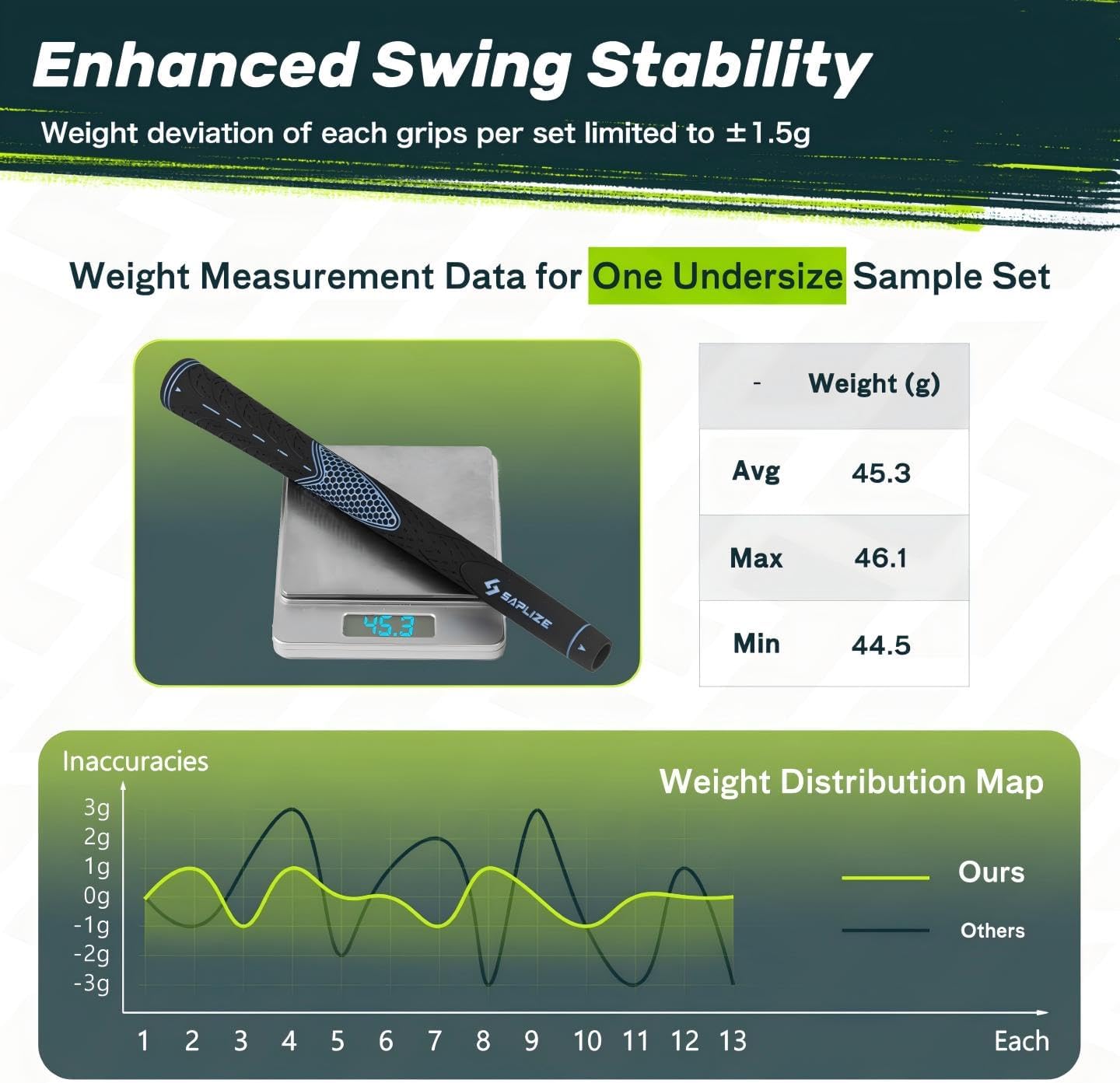 - Enhance Swing Stability: The weight deviation of the 13 grips set is limited to +/-1.5 g. Comparing with the industry standard of +/- 3 g, this will greatly enhance your swing stability
