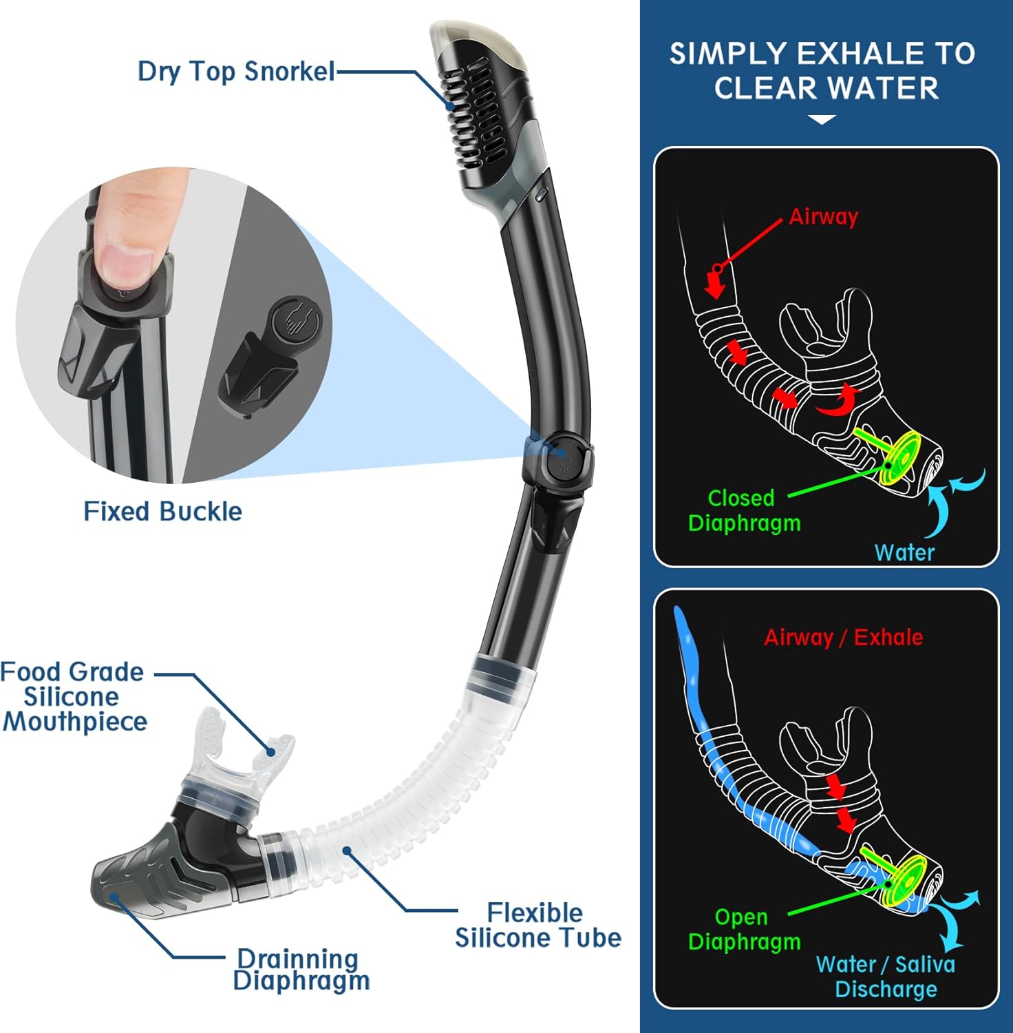 - Unobstructed breathing dry top snorkel: a high-quality snorkel with a dry-top valve that seals the breathing tube when submerged. dry top snorkel is designed to keep water from entering the breathing tube, ergonomic silicone mouthpiece is comfortable and durable. Lower purge valve allows water to be quickly expelled, so you can enjoy easy and unobstructed breathing while diving underwater.