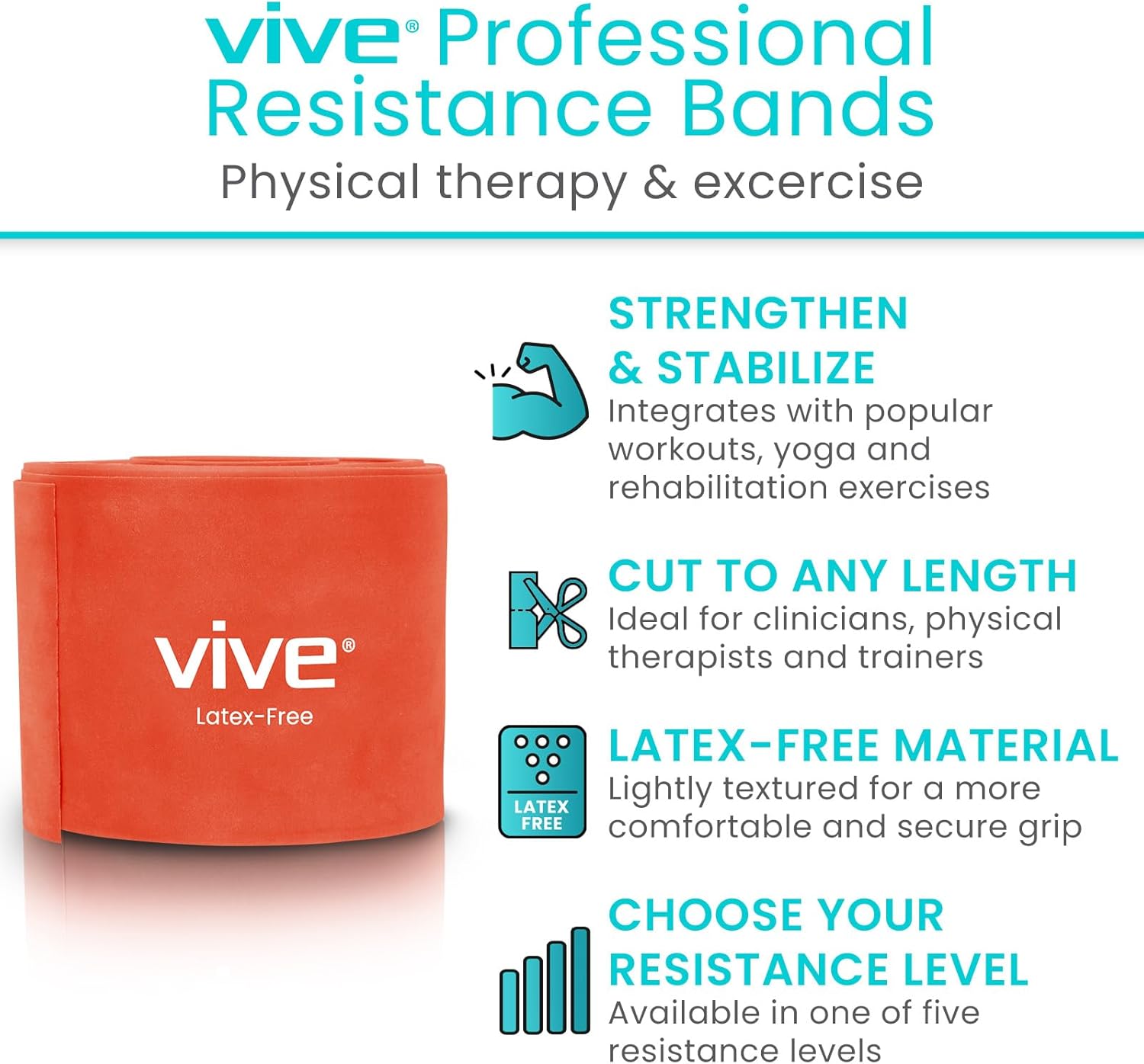 - CUT TO ANY LENGTH: The perfect option for a customized resistance band, the Vive resistance band rolls can be cut to any length for integrative workouts, rehabilitation, strength training or physical therapy. Ideal for clinicians, physical therapists and trainers.