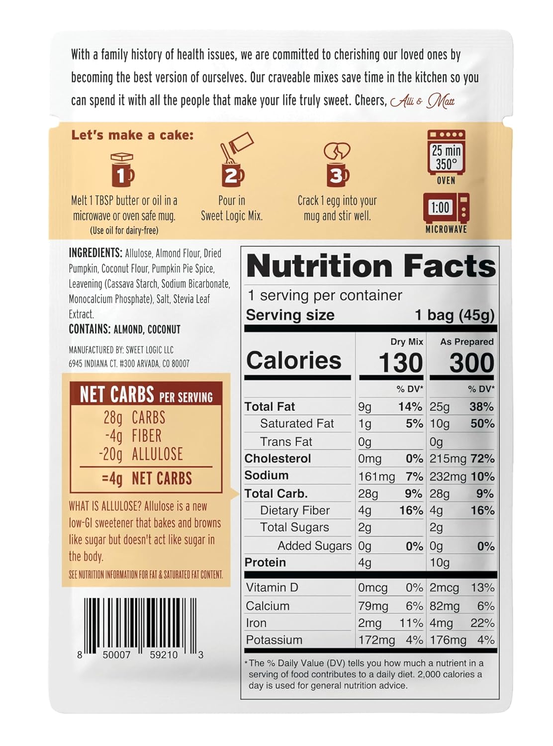 SWEET LOGIC Keto Dessert Mug Cake Mixes - Refined Sugar Free Gluten Free Keto Snack - 4 Keto Mug Cake Mixes - Pumpkin Spice - Diabetic Friendly Keto Sweets and Treats