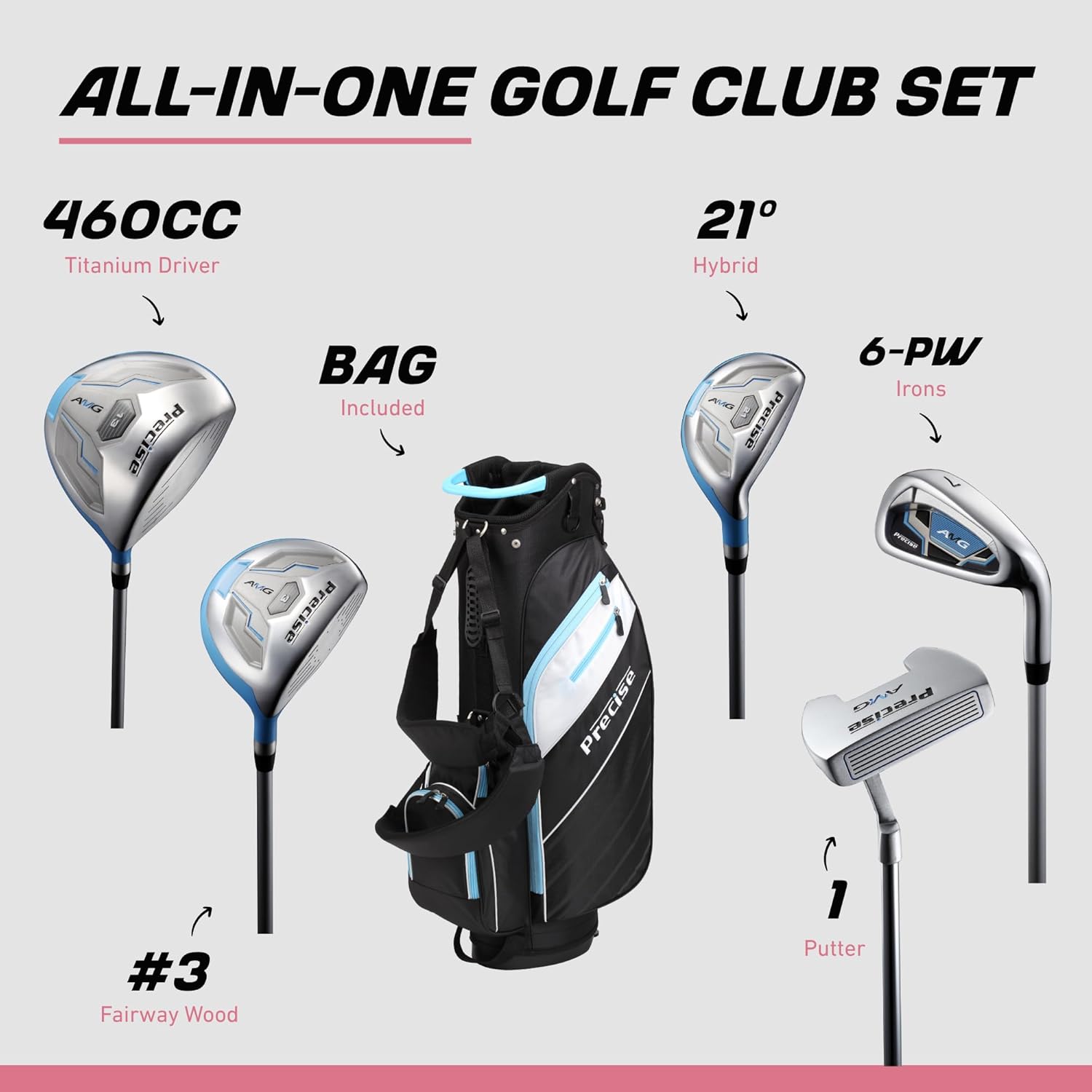 Precise AMG Complete Womens Golf Clubs Set, Includes Driver, Fairway, Hybrid, 6-PW Irons, Putter, Stand Bag, 3 H/C's, Golf Clubs Women Right Handed, Regular & Petite Sizes