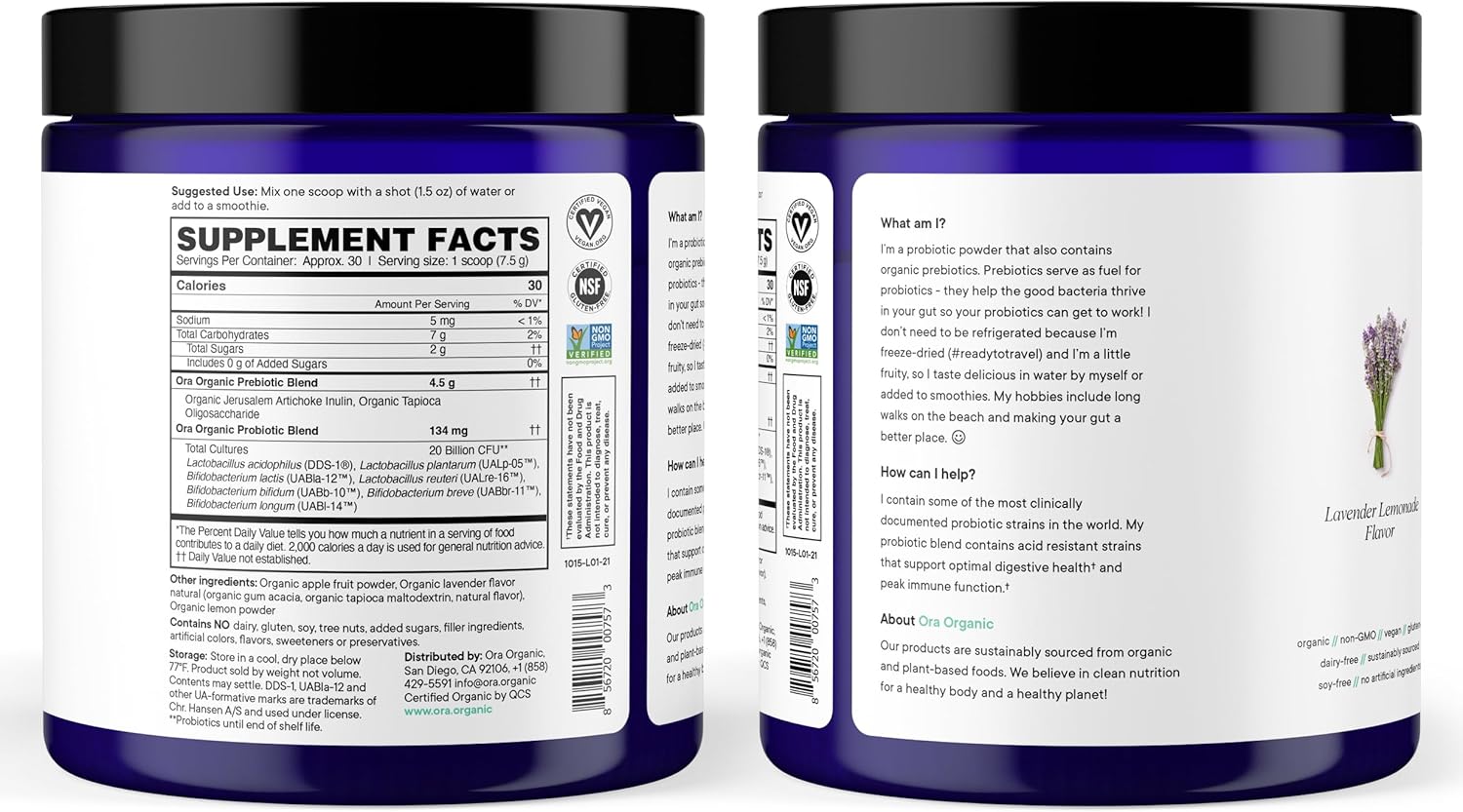 Ora Organic Prebiotic and Probiotic Powder Supplement - 20 Billion Probiotics, 7 Strains for Best Prebiotic Powder, Non-GMO, Probiotics for Women, Men & Kids - Lavender Lemonade Flavor, 30 Servings