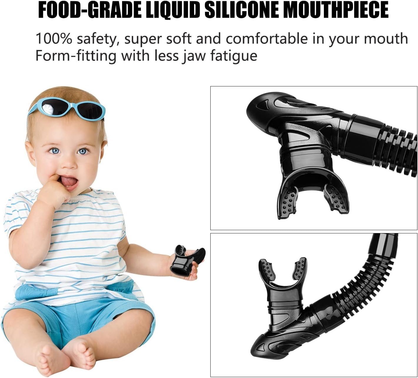 - Advanced Dry Valve and Splash Guard: The innovative dry top valve automatically seals when submerged, effectively blocking water entry. The splash guard further protects against waves, while the advanced design prevents clogging from sand or debris, ensuring consistent and comfortable breathing.