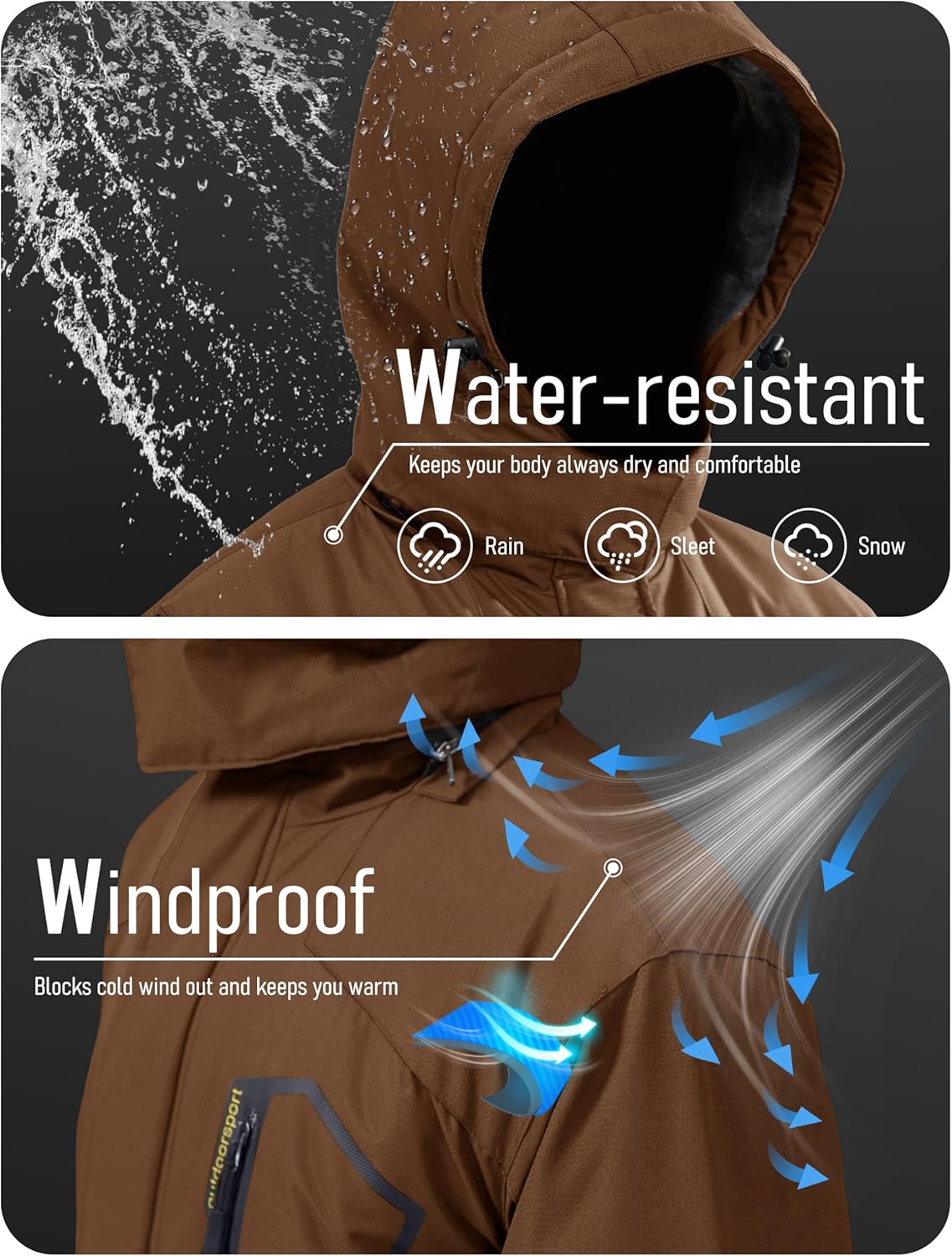 • Water repellent: Professional water repellent jacket, keep your body always dry and comfortable, you won't worry about getting wet while skiing, snowboarding, hunting, hiking in inclement weather.