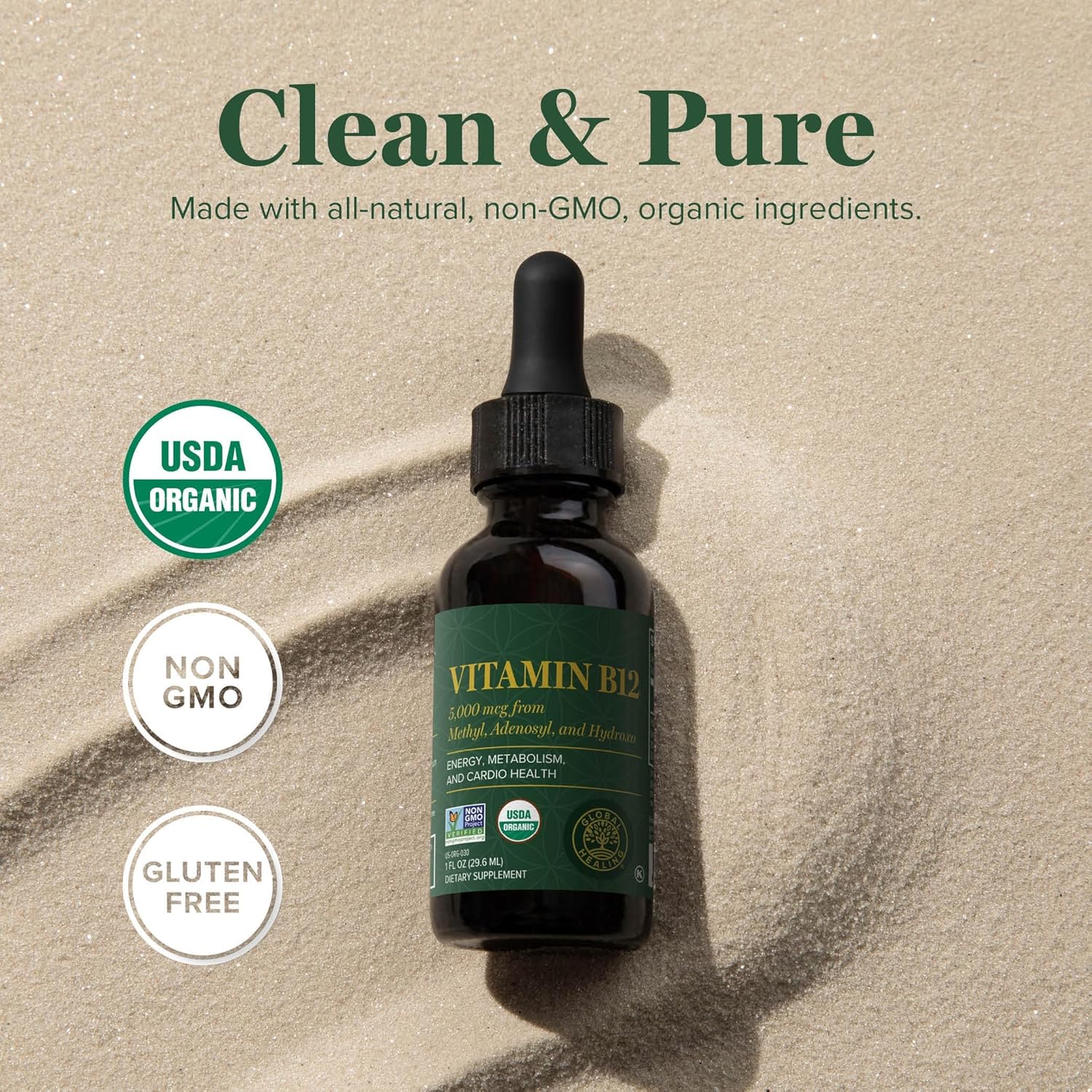 Global Healing Center - Vitamin B12 Sublingual 5000 MCG Organic Liquid Supplement, Methylcobalamin, Adenosylcobalamin, Hydroxo Long-Lasting Energy and Healthy Metabolism - Vegan B12 Vitamins (1 Oz)