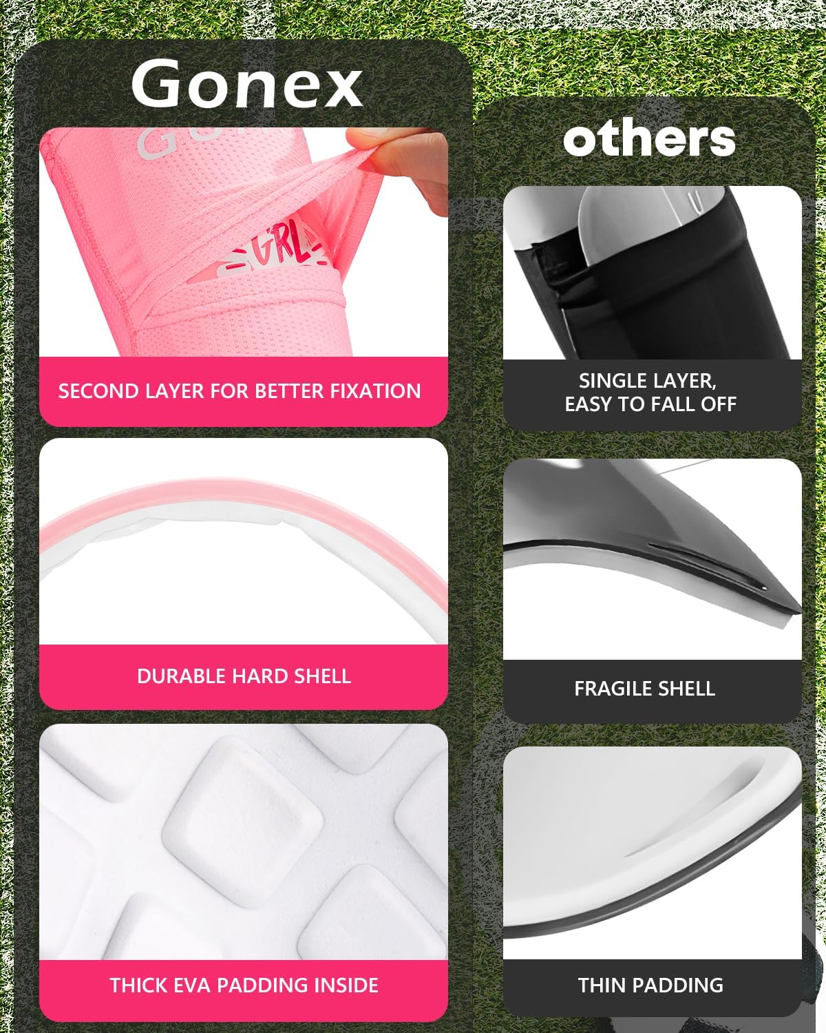 - Regularly Gridded EVA Padding Distribute Shocks Away: Gridded EVA padded guards not only reduces shocks as normally shin guards do, but also has better performance in helping distribute impact away. In this way, it prevents violent impact from directing to one position of your shin or leg, so as to avoide serious injuries or severe wound when playing soccer games